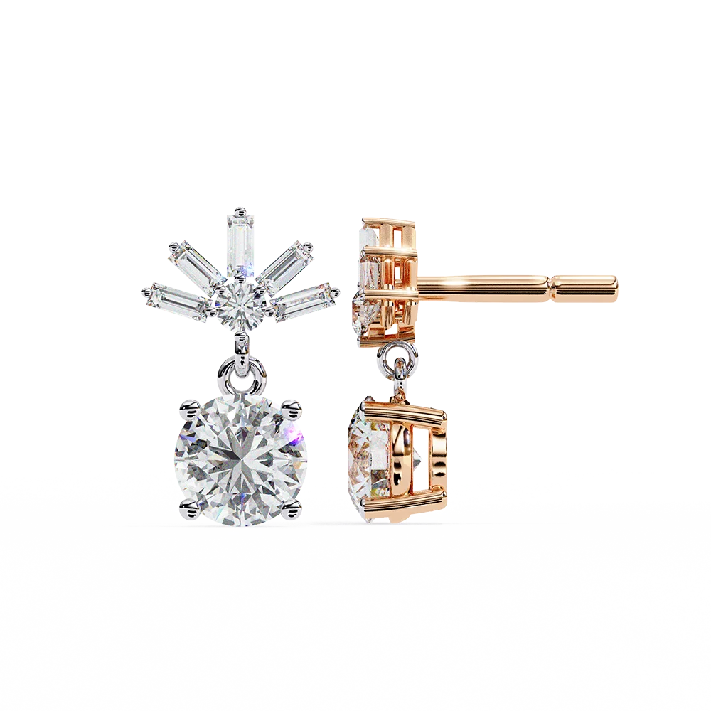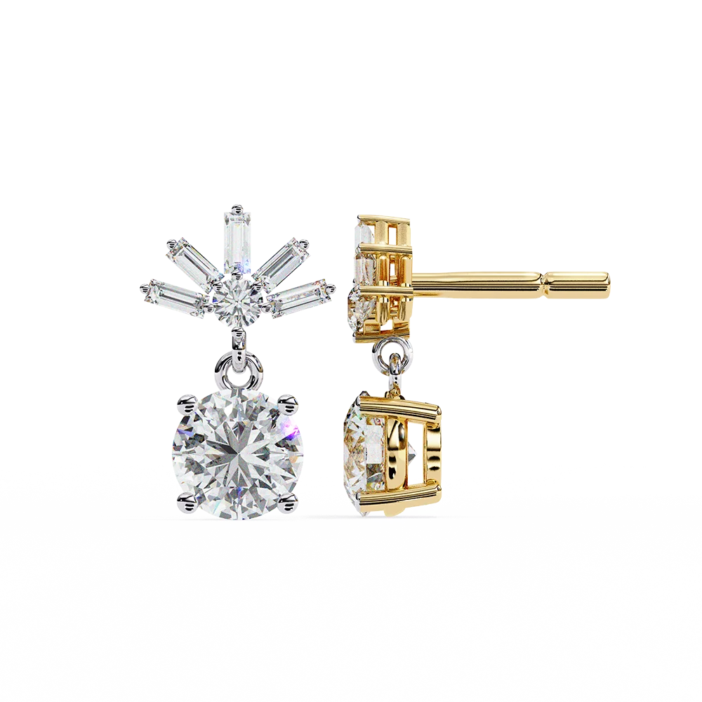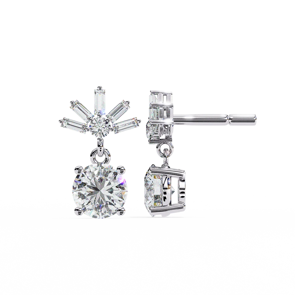 Radiant dangling solitaire earrings crowned with a starburst of baguette diamonds.