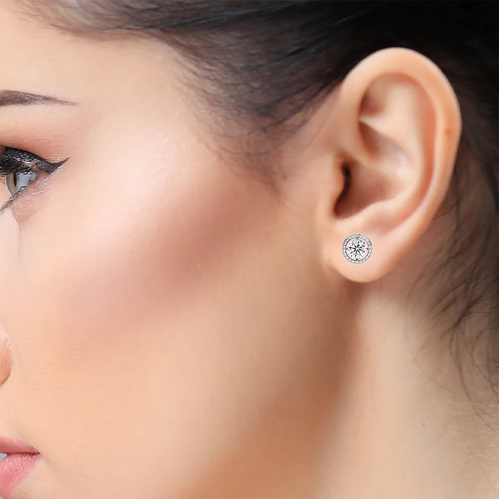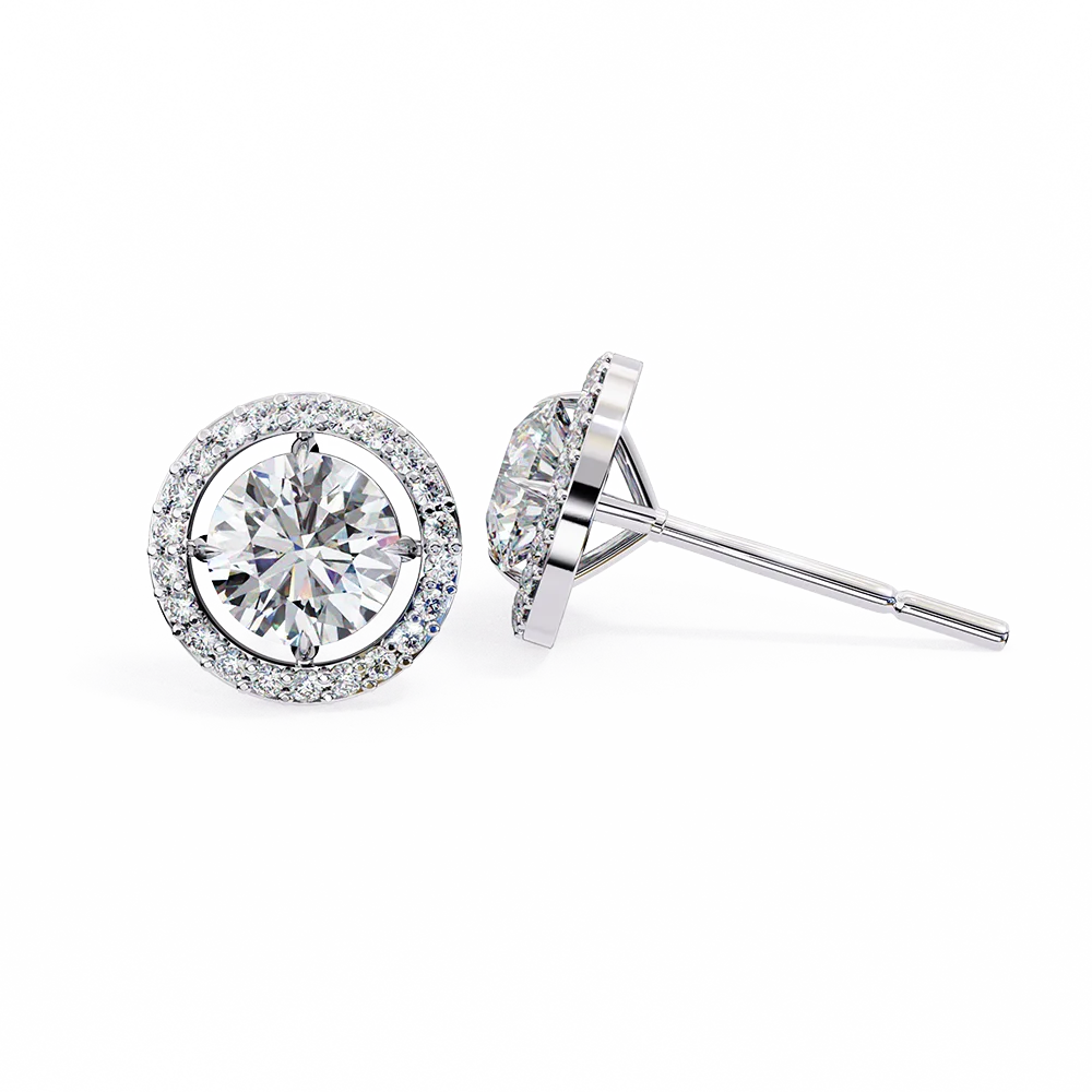 Round Centre Diamond Earrings embraced by a shimmering halo of diamonds.