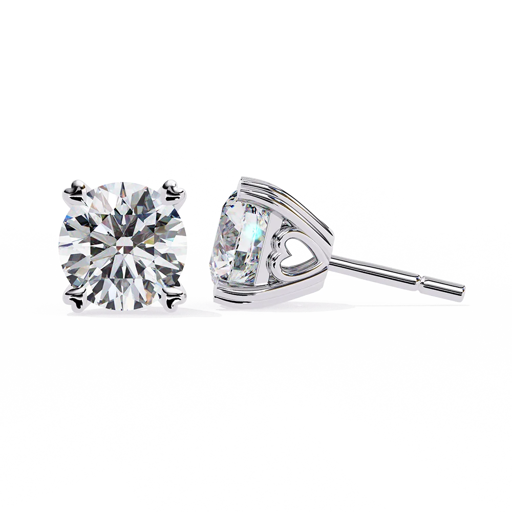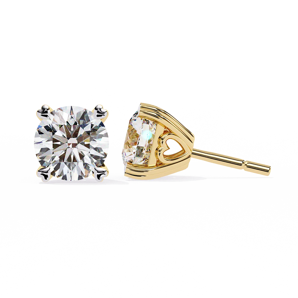 Romantic round diamond stud earrings with a heart-accented gold setting.