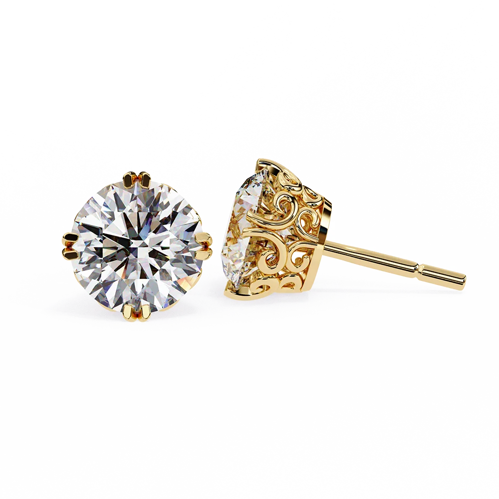 Elegant round diamond stud earrings with ornate filigree gold detailing.