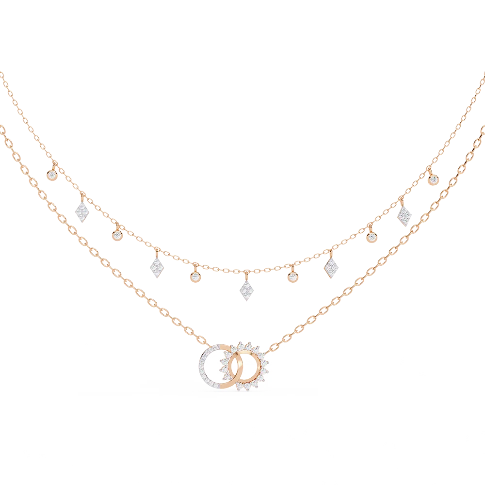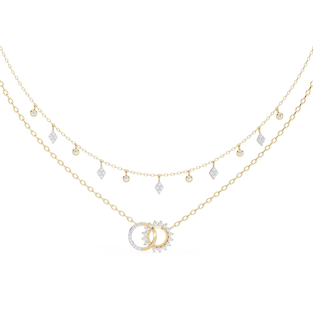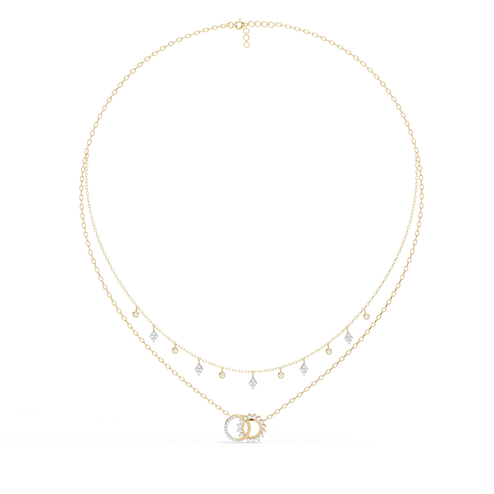 Dainty layered gold necklace with celestial sun and moon pendant.