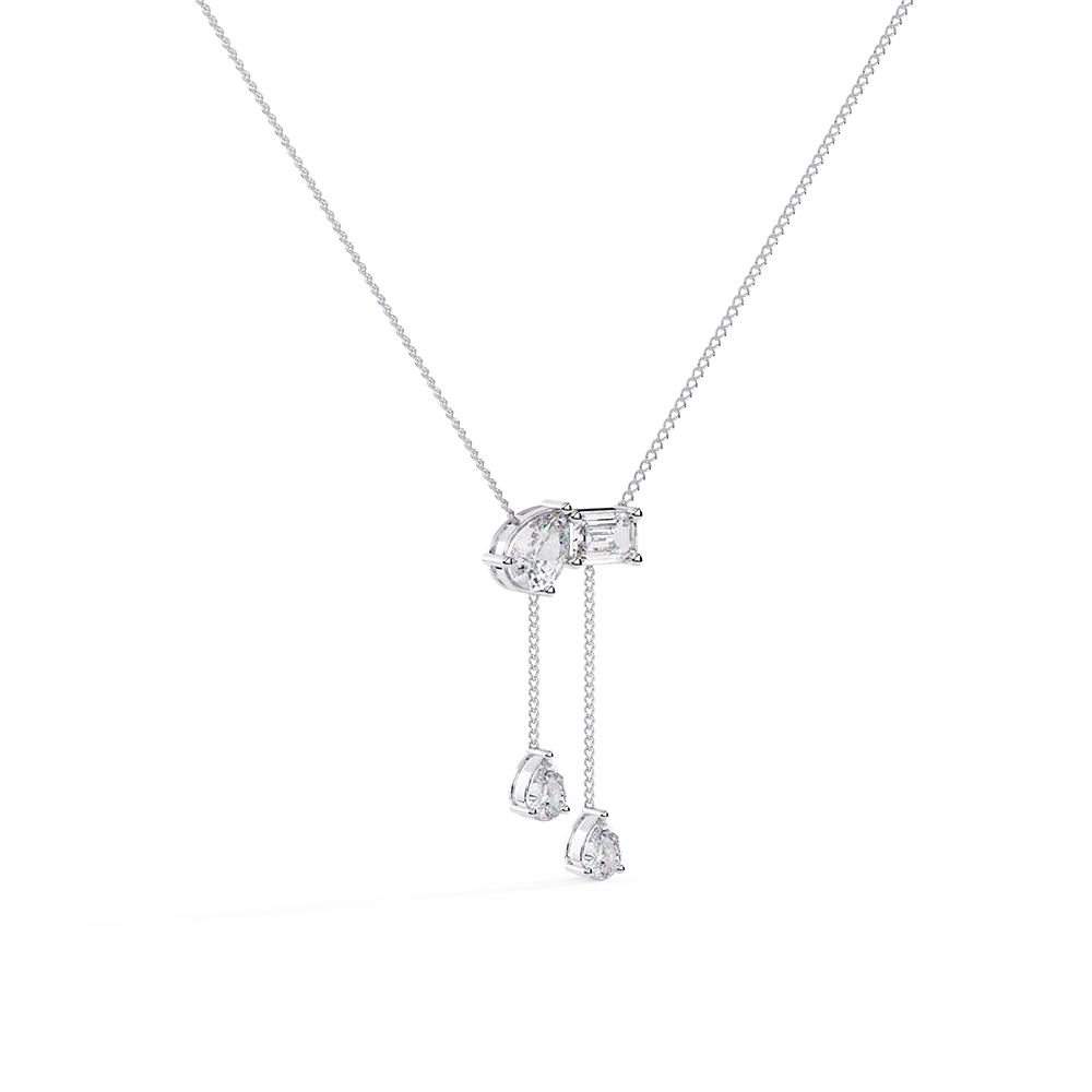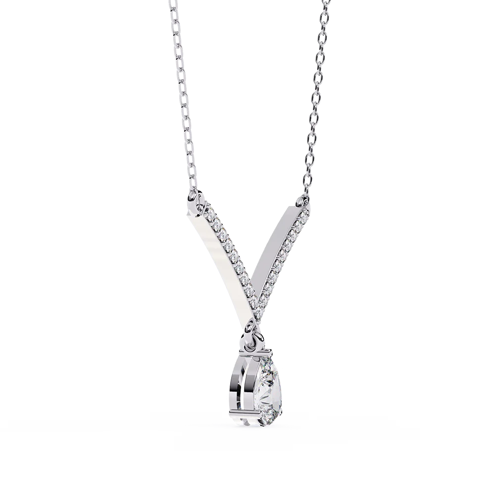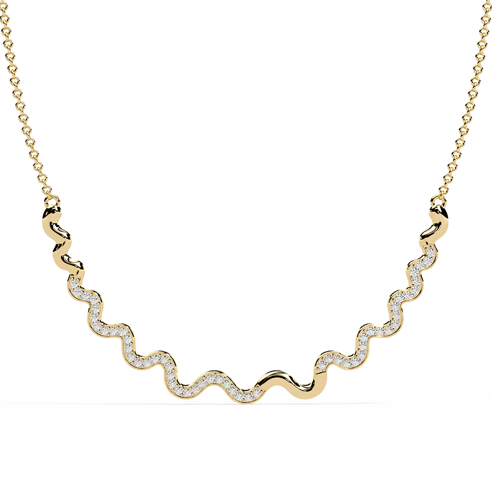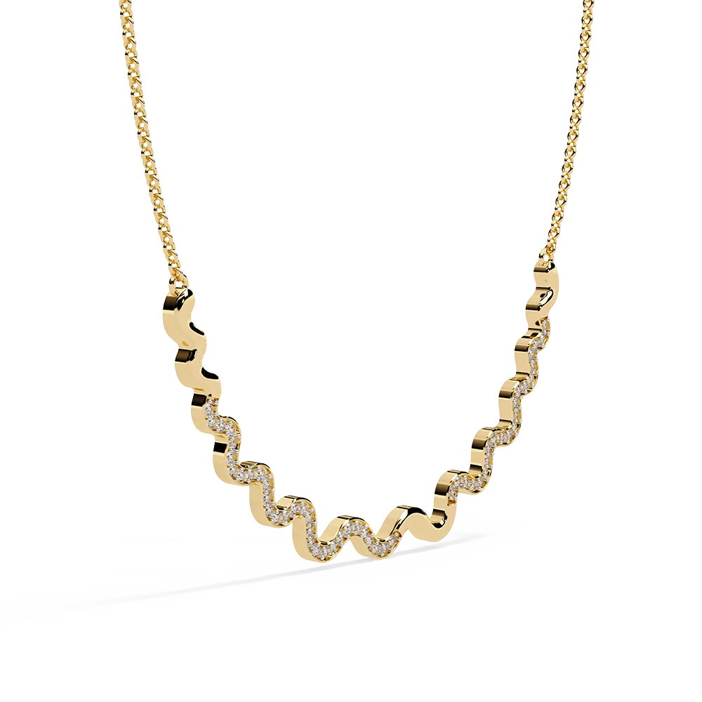 Graceful curvy pendant adorned with shimmering diamonds and gold framework.