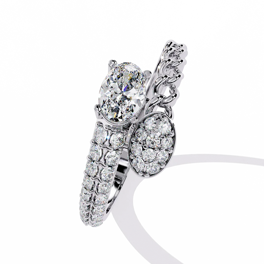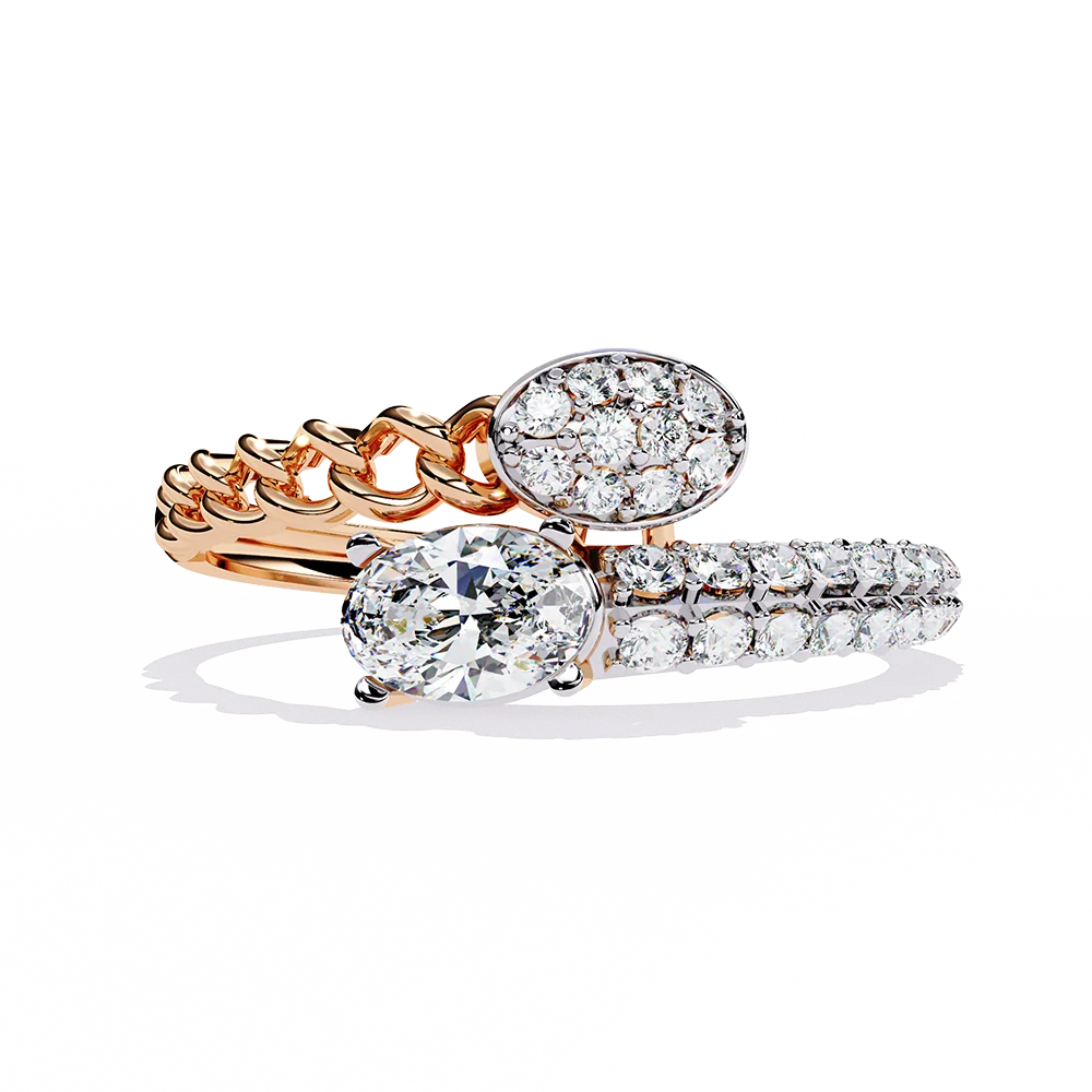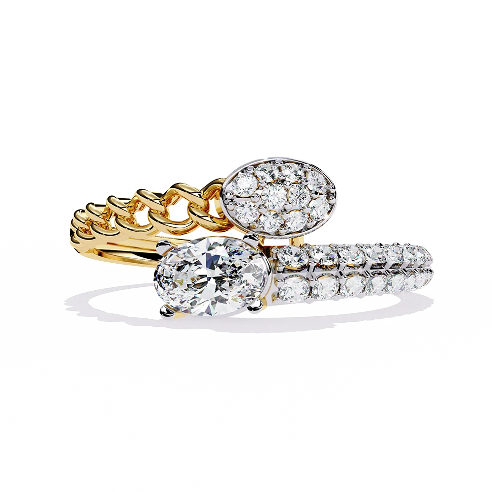 Bypass ring with oval solitaire and diamond cluster on dual gold bands.