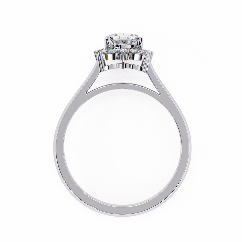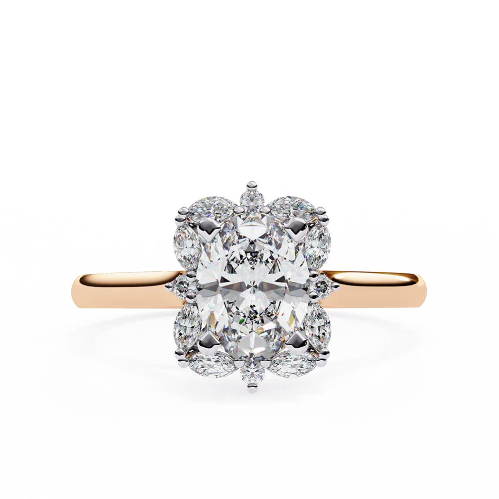 An oval solitaire ring with a plain shank and marquise diamonds clustered around the center.