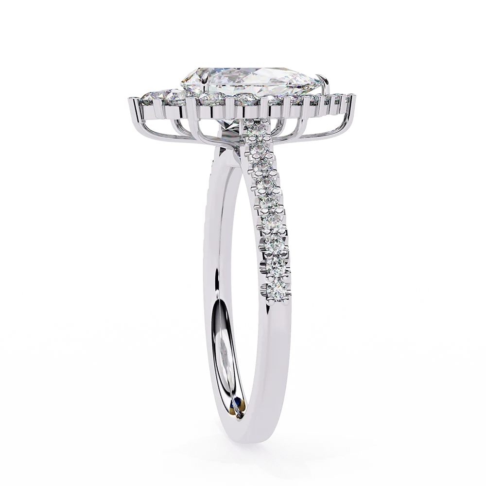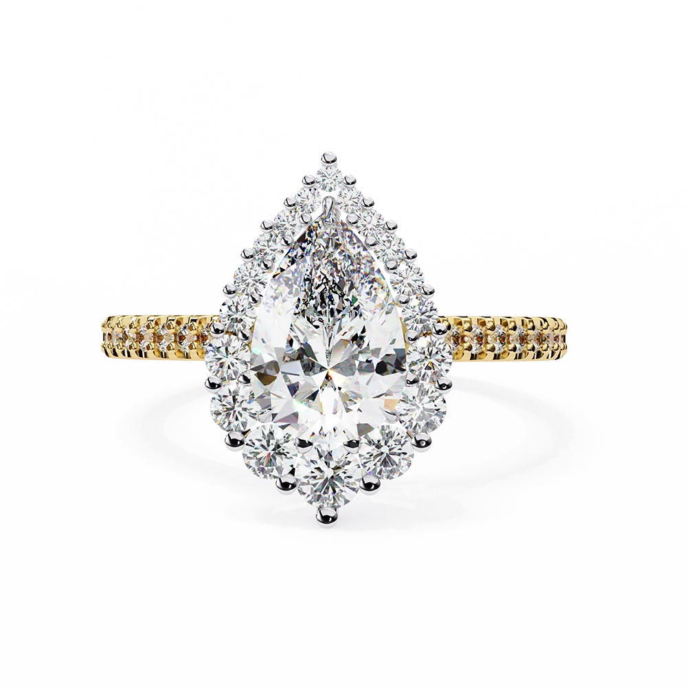 A pear-shaped ring adorned with a cluster of round diamonds and a U-cut pavé shank.