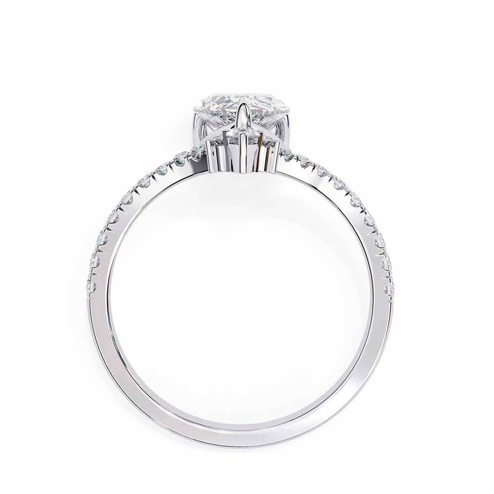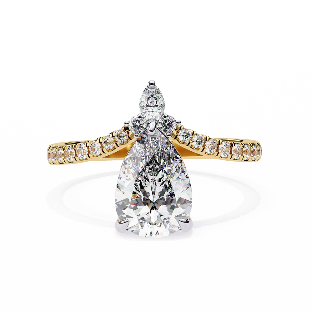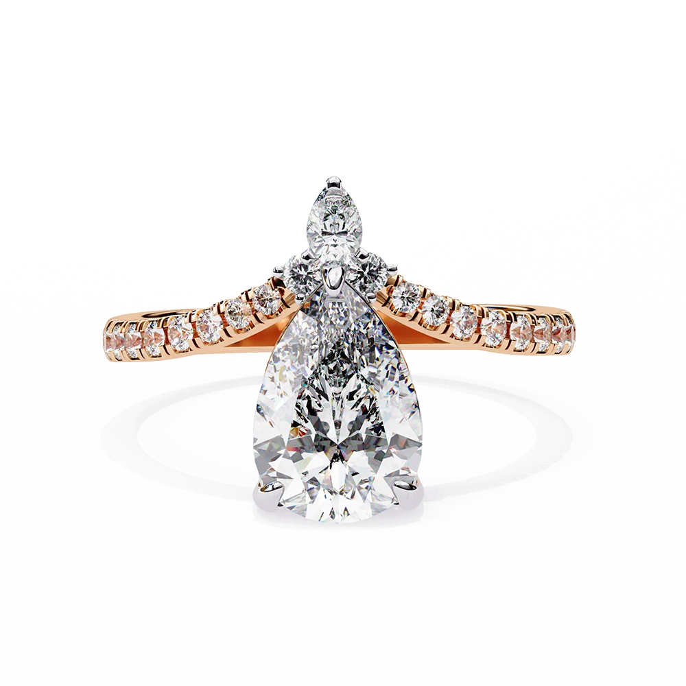 Pear solitaire framed by round and marquise diamonds in a floral layout on diamond shank.