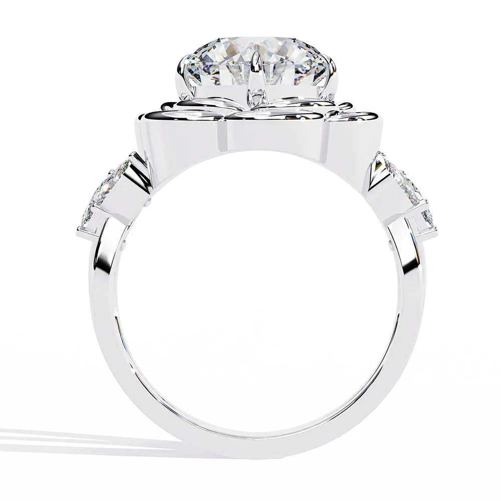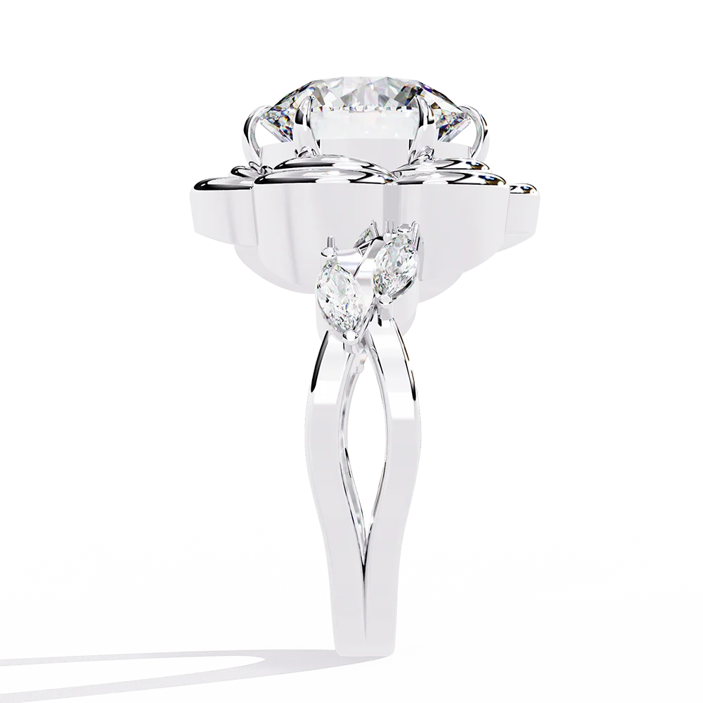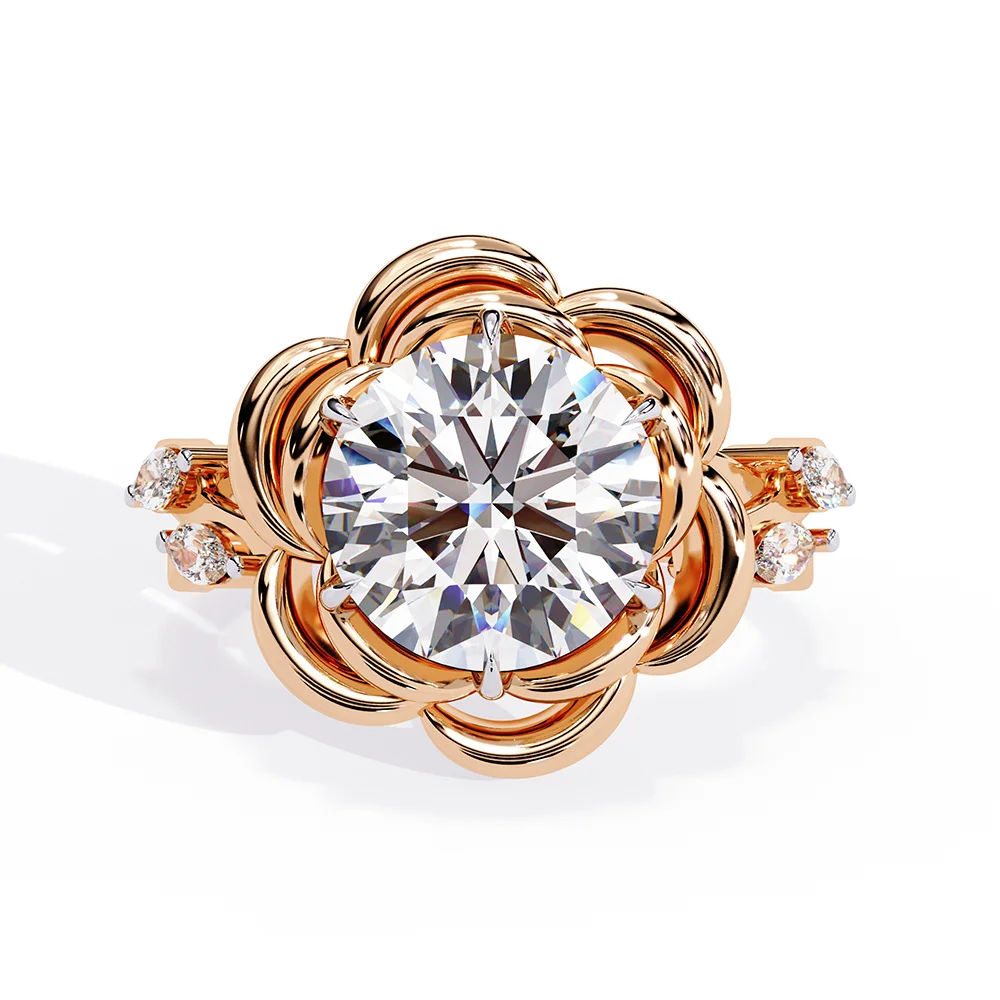 Center diamond cradled in a basket resembling layered flower petals.