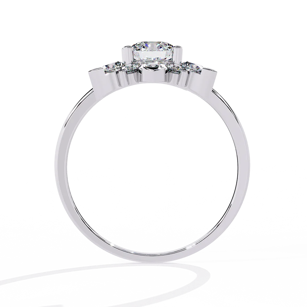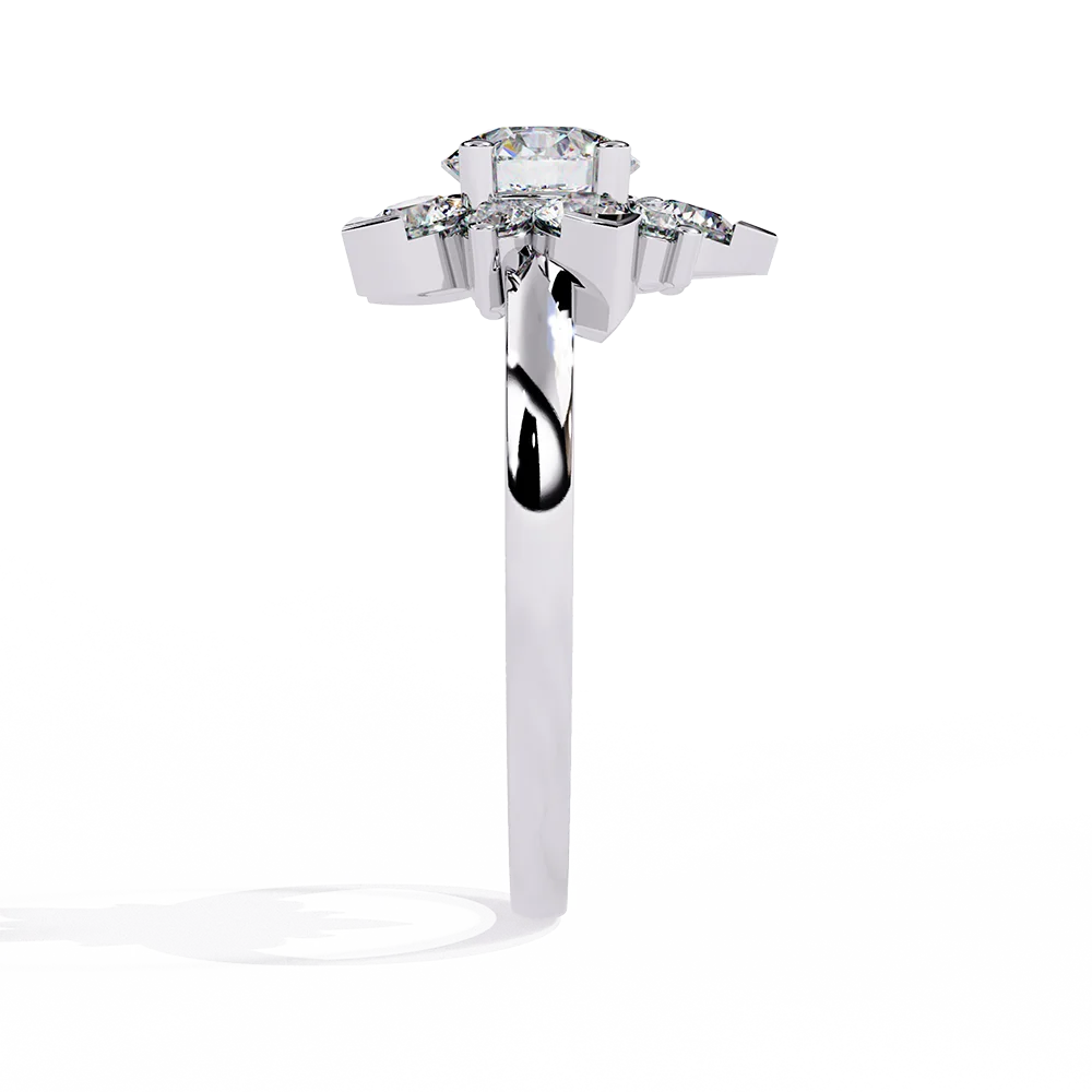 Round solitaire diamond nestled within a delicate flower-shaped smaller diamonds.