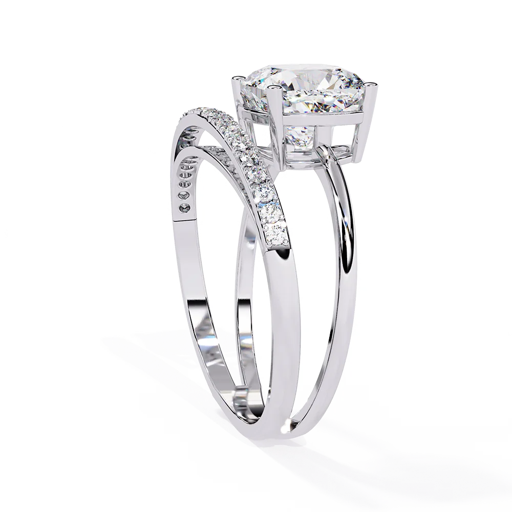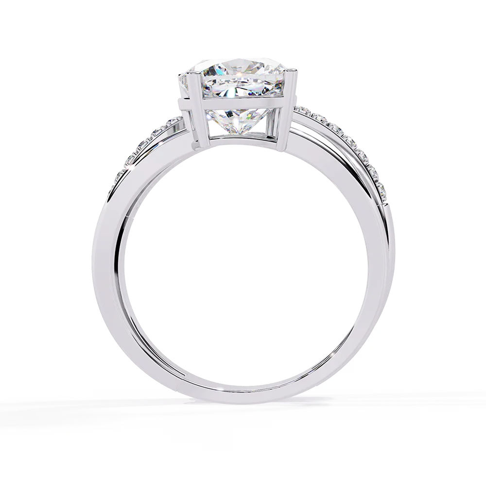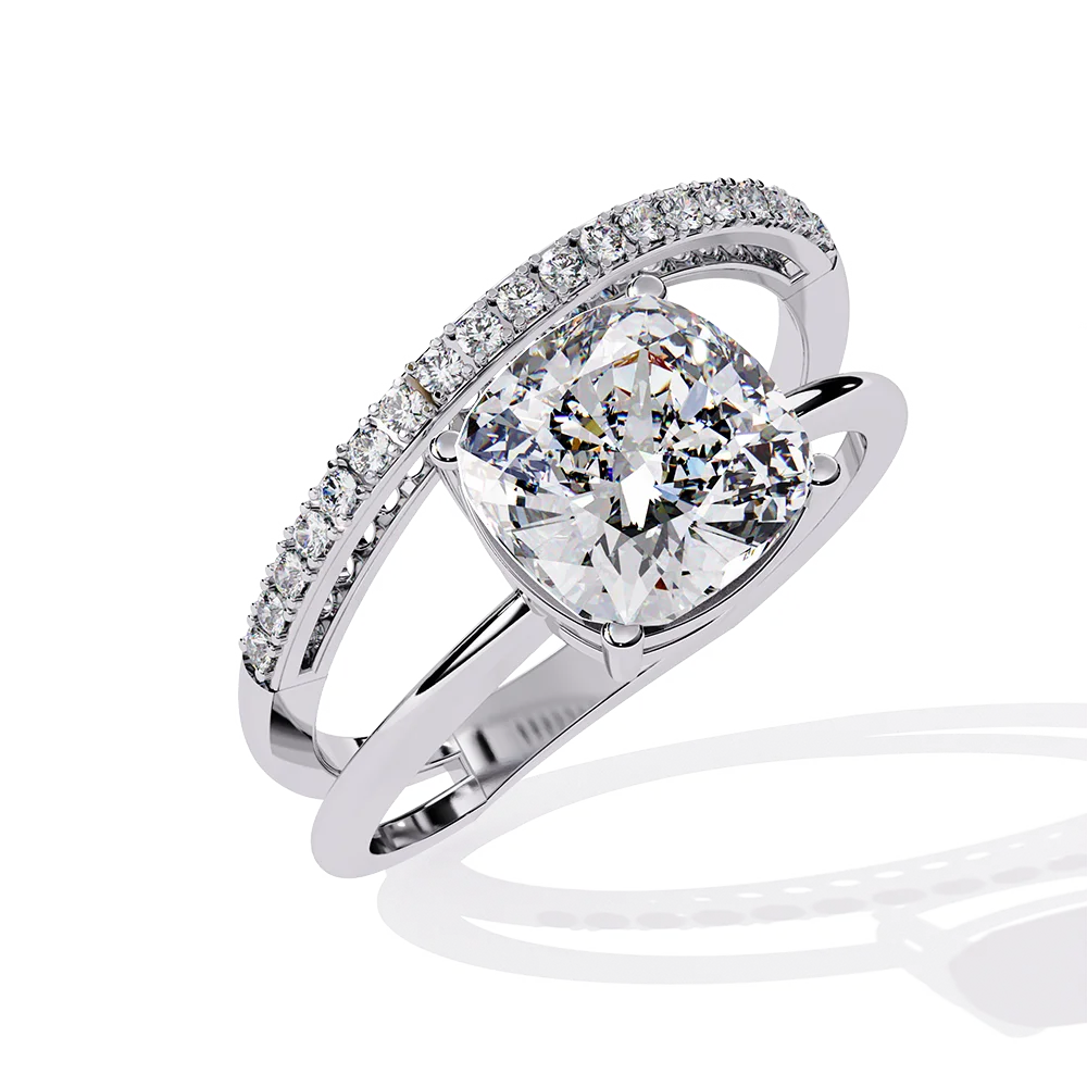 A cushion solitaire Ring set apart with a contrasting Diamond shank design.