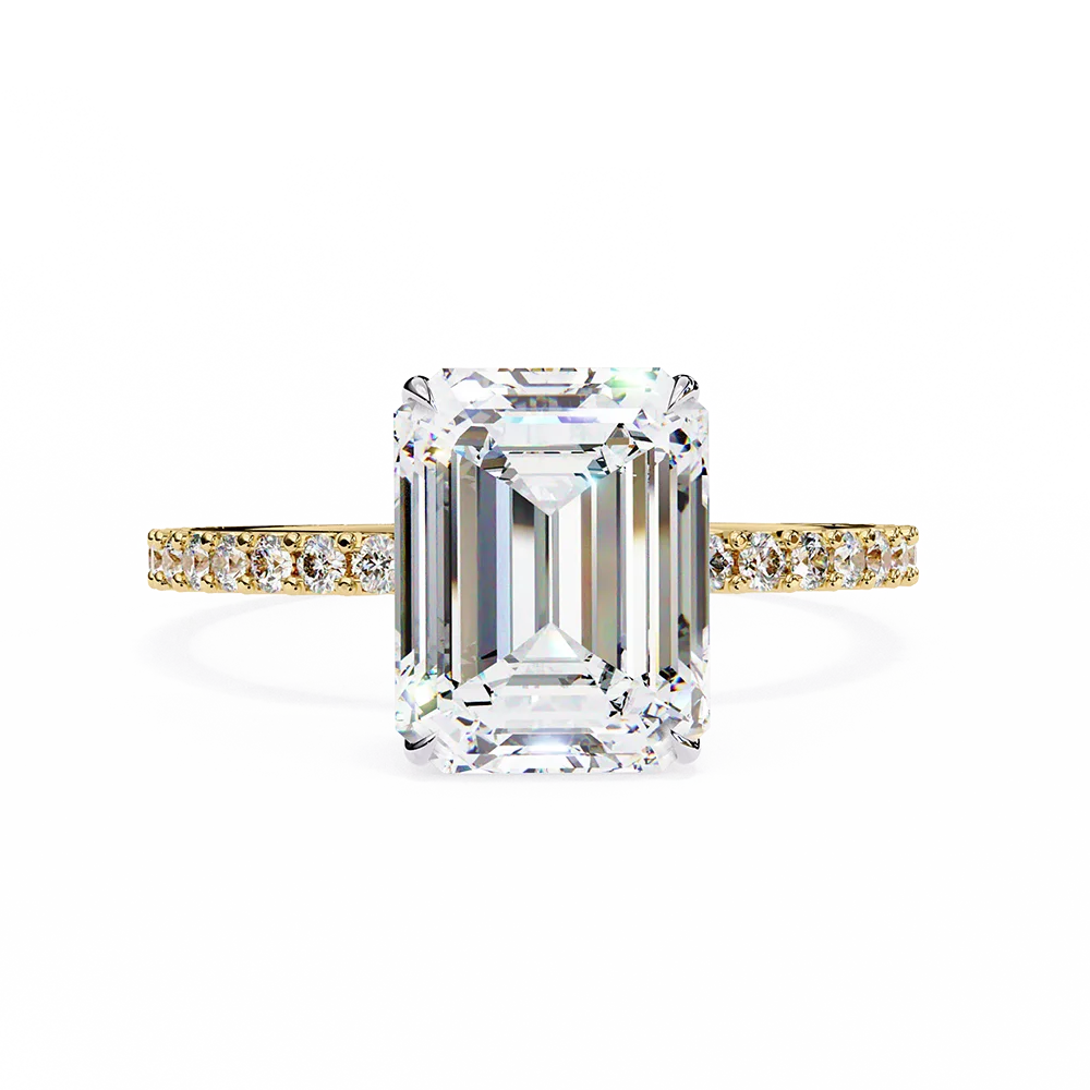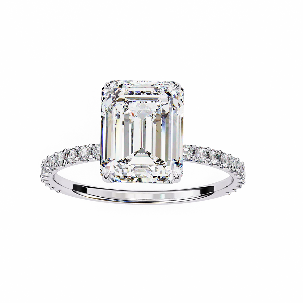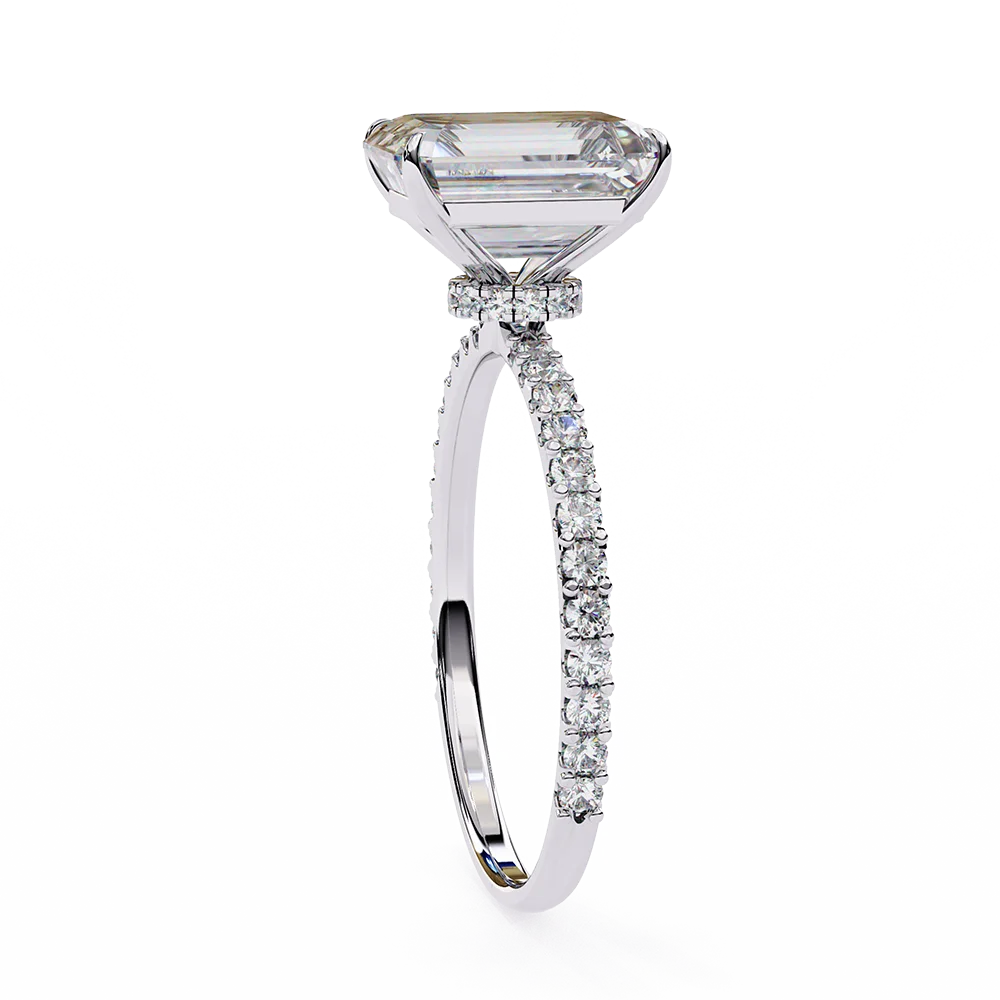 Ring having Diamond band beneath the collet of Emerald-cut solitaire to elevates it for a heightened sparkle.