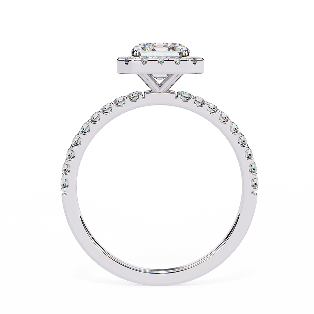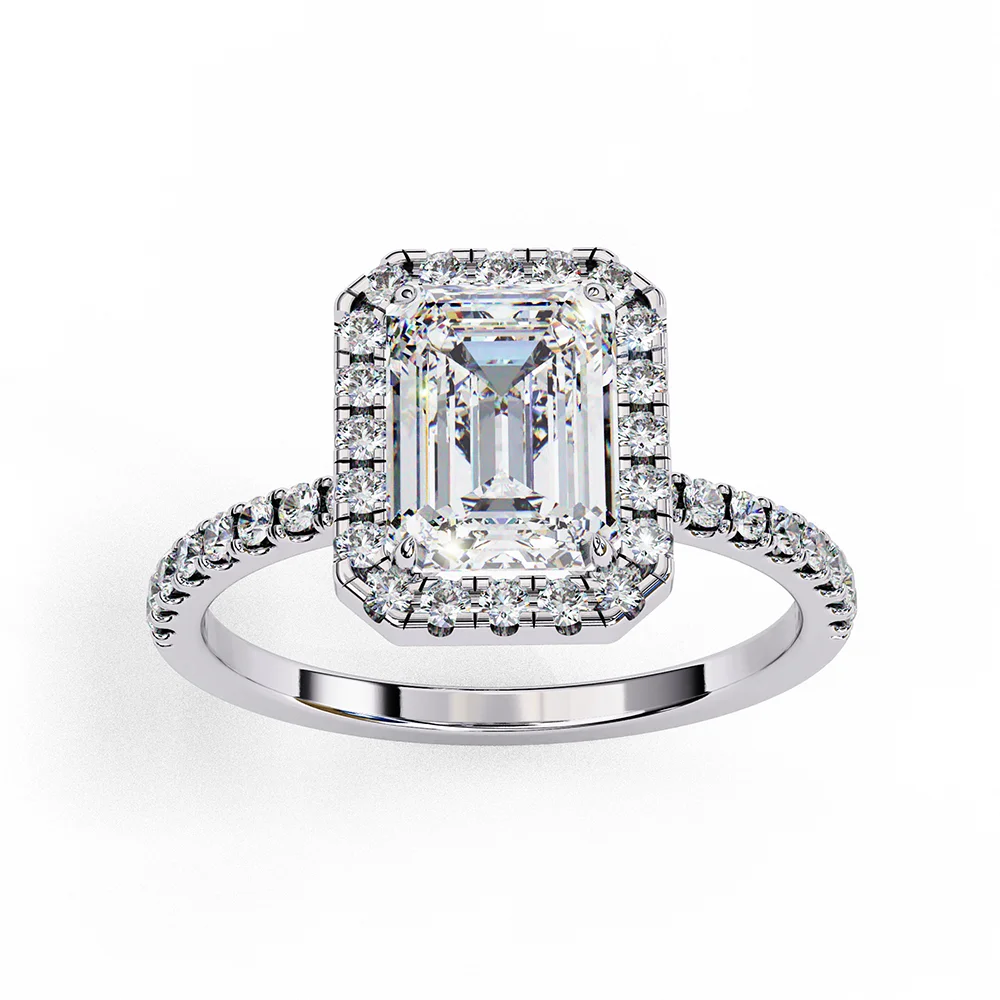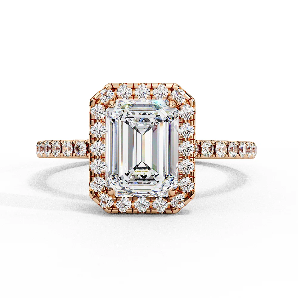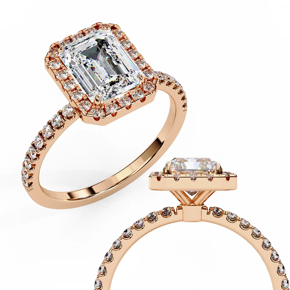 Emerald halo ring encircled with diamonds for a radiant, show-stopping elegance on diamond studded shank.