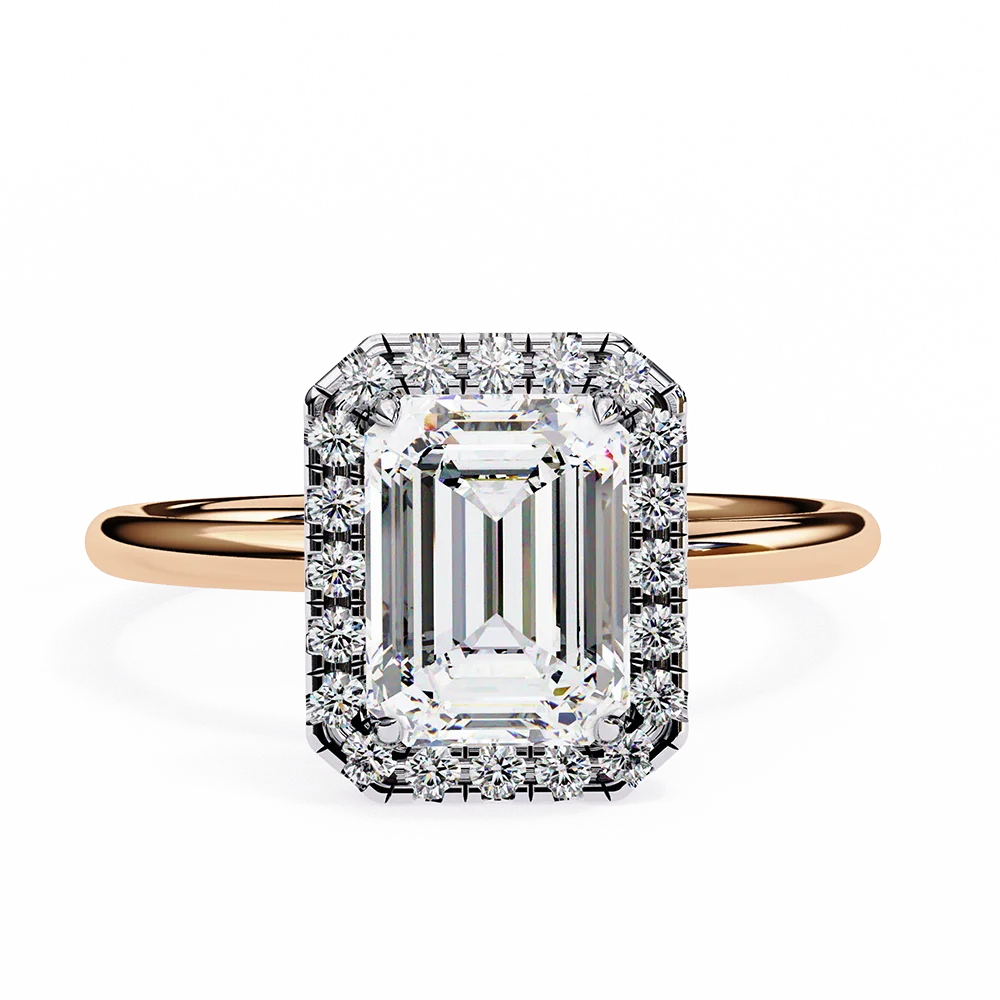Emerald halo ring encircled with diamonds for a show-stopping elegance on simple band.