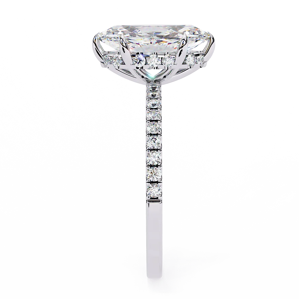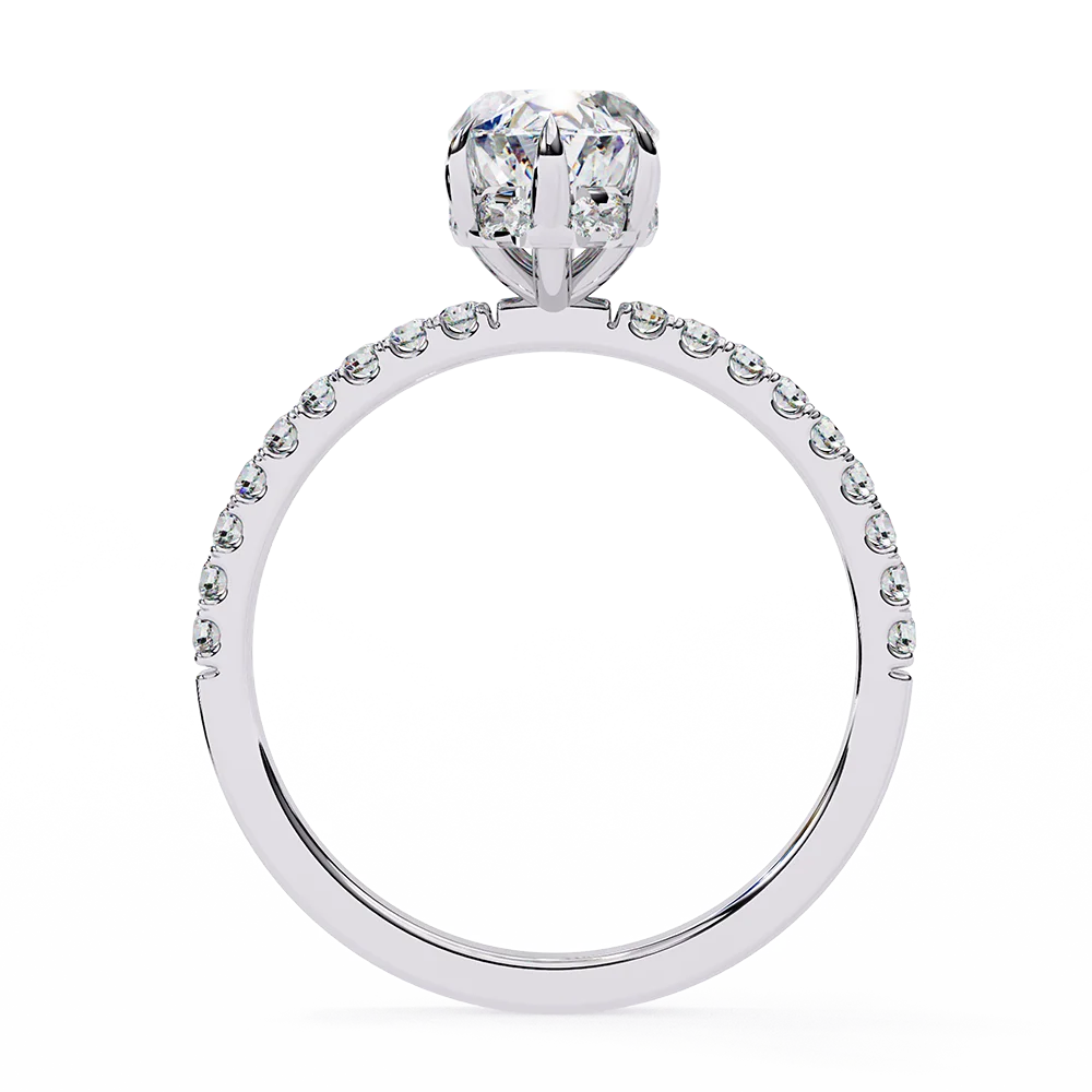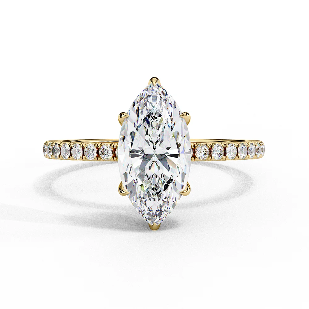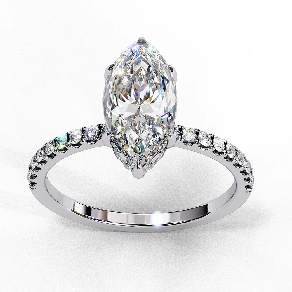 Marquise solitaire diamond set on a sparkling diamond-studded shank for an elegant allure.