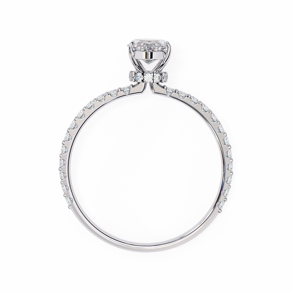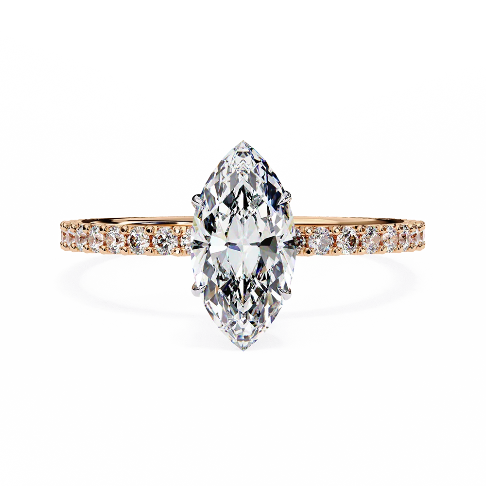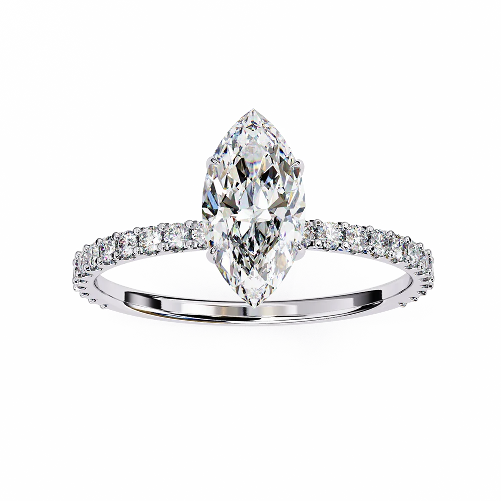 Ring having Diamond band beneath the collet of Marquise solitaire to elevate diamond for a stunning, heightened sparkle.