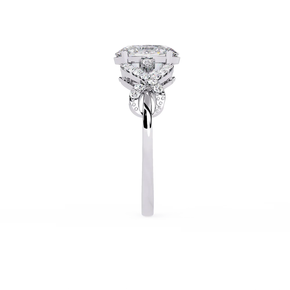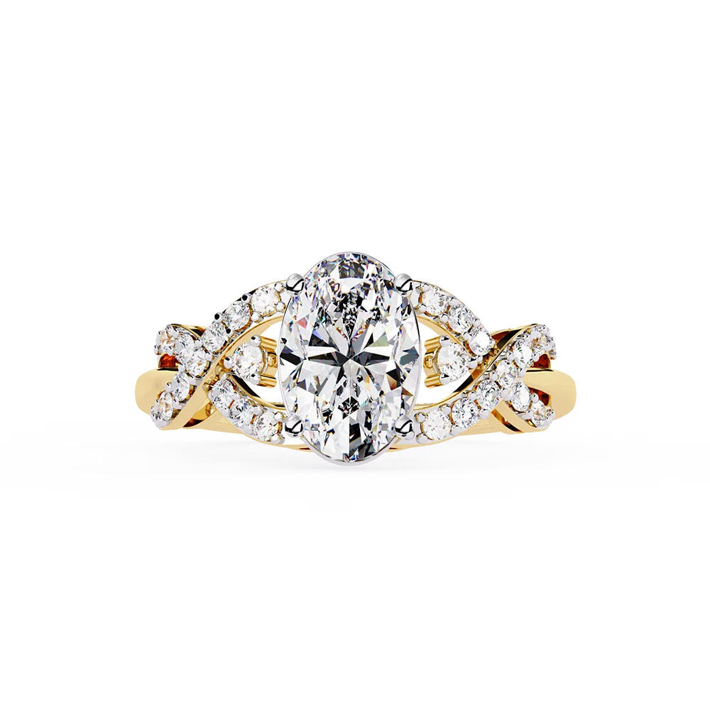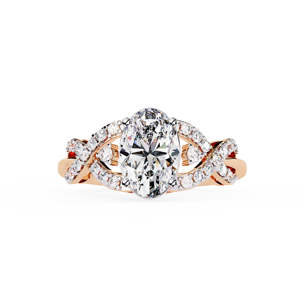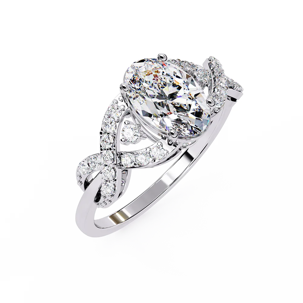 Oval solitaire on a symmetric, patterned fancy shank emphasizing balanced proportions.