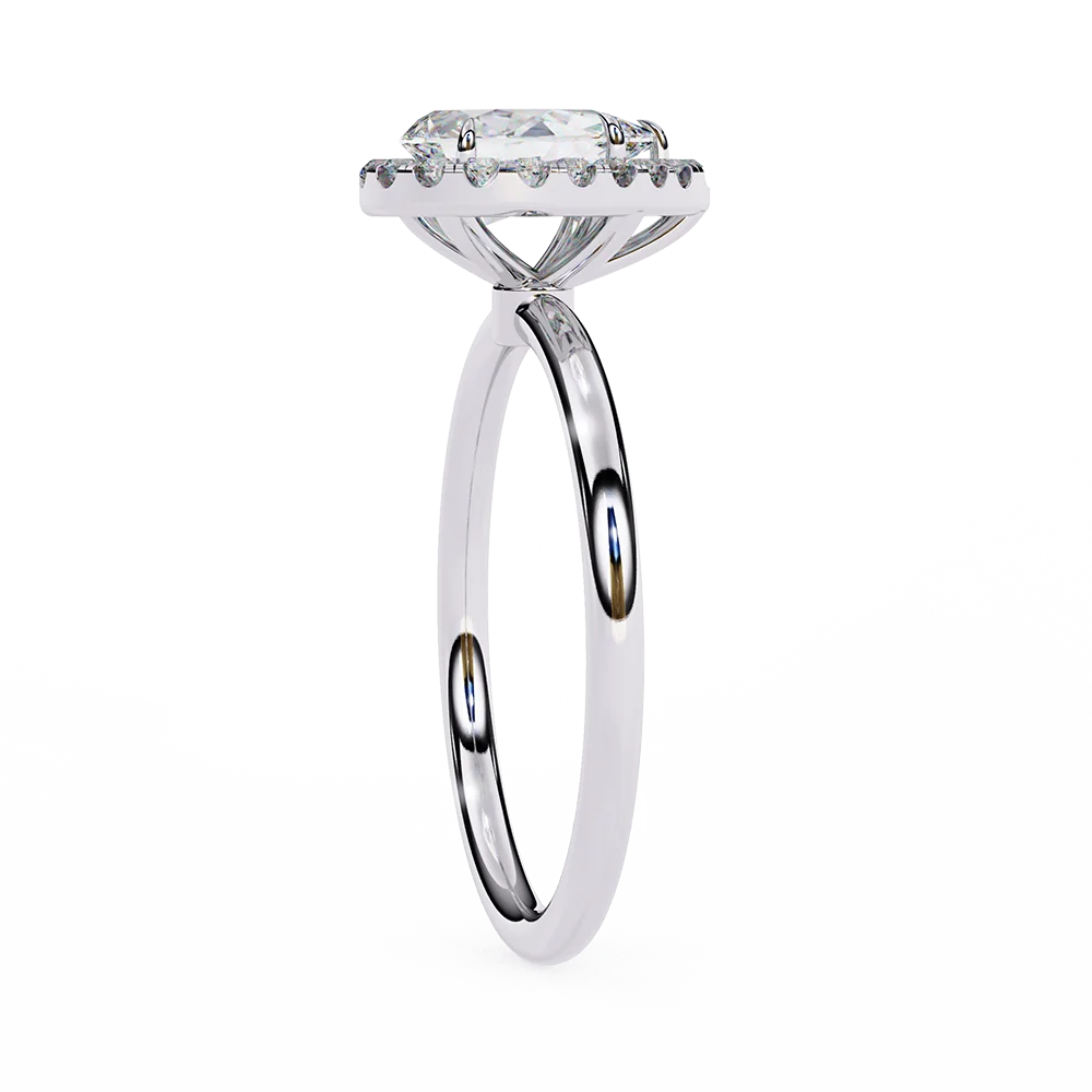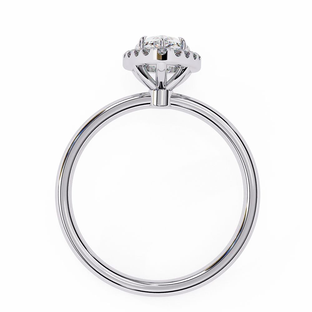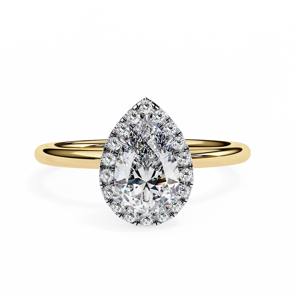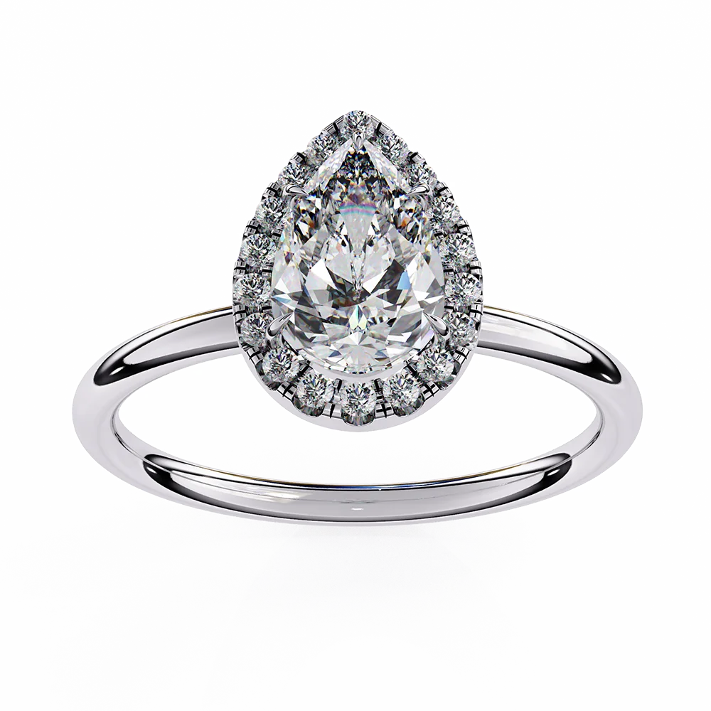 Pear solitaire with a surrounding halo of small diamonds, set on a simple band.
