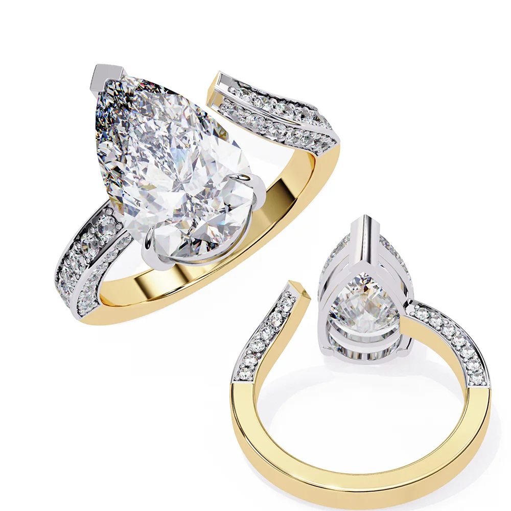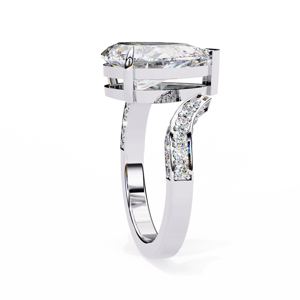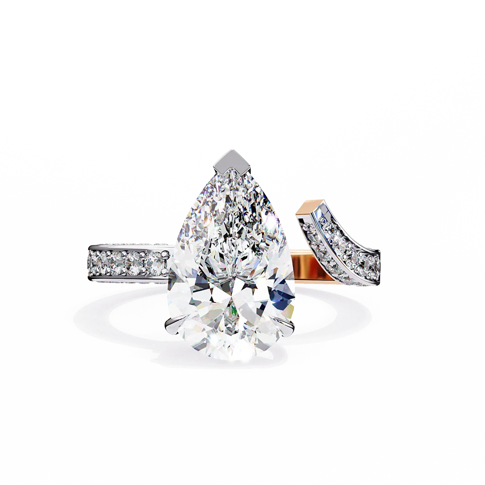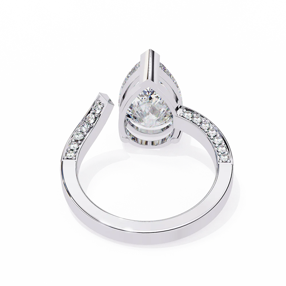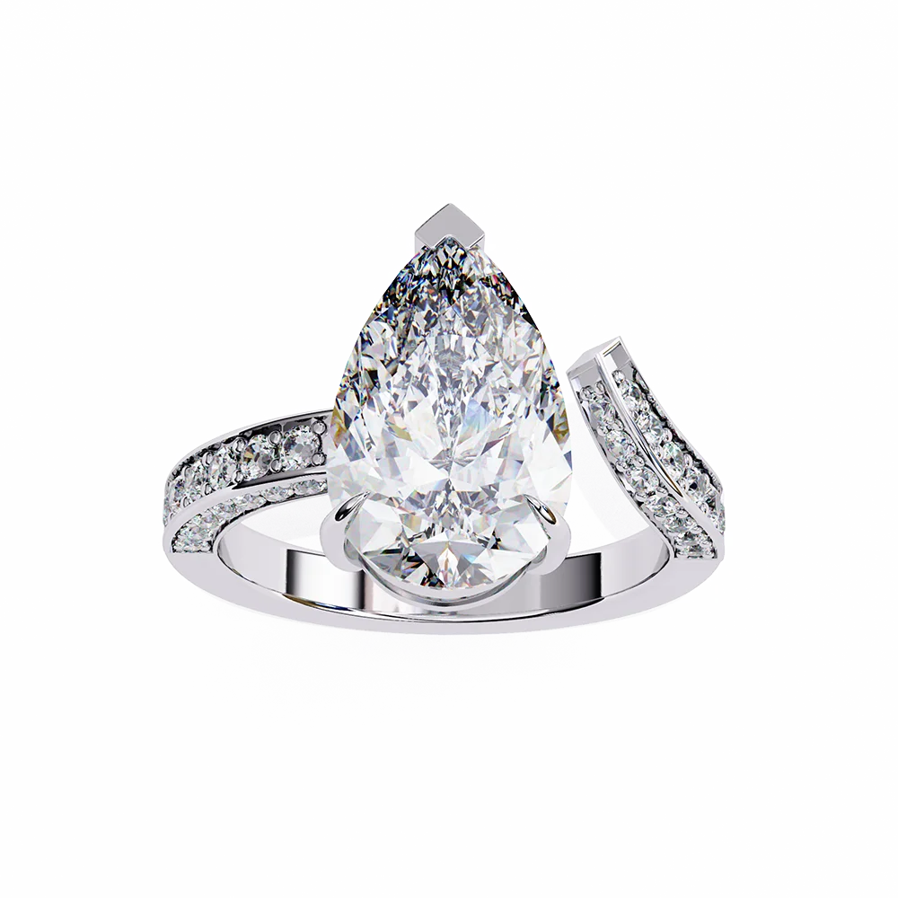 One Sided bend diamond studded pave shank with center Pear Solitaire for a classic look.