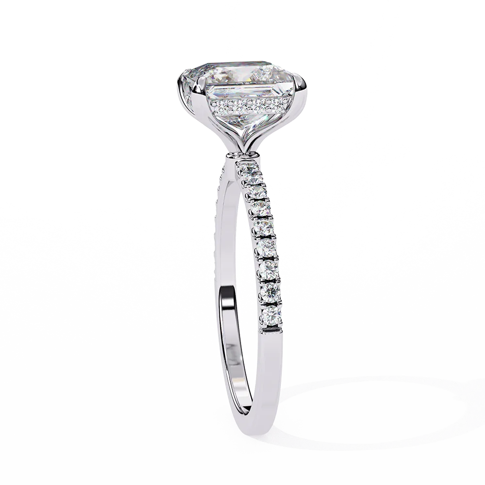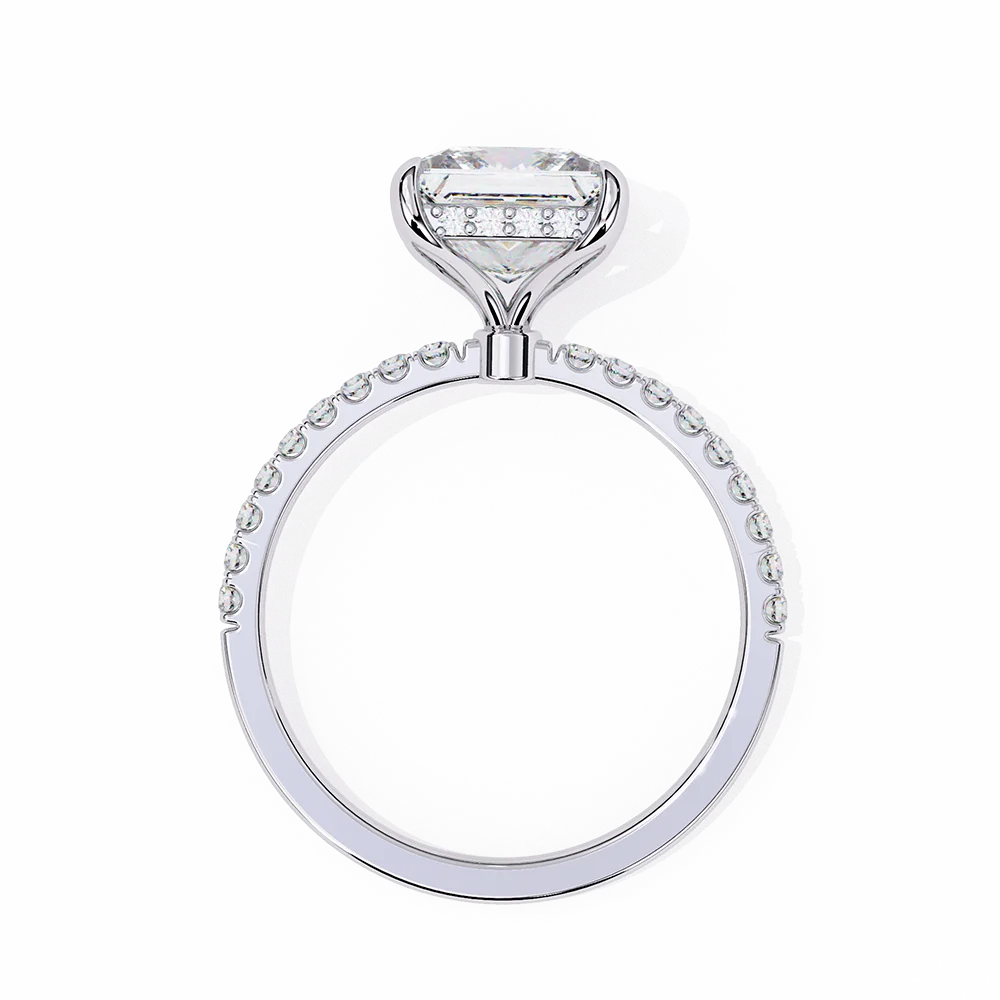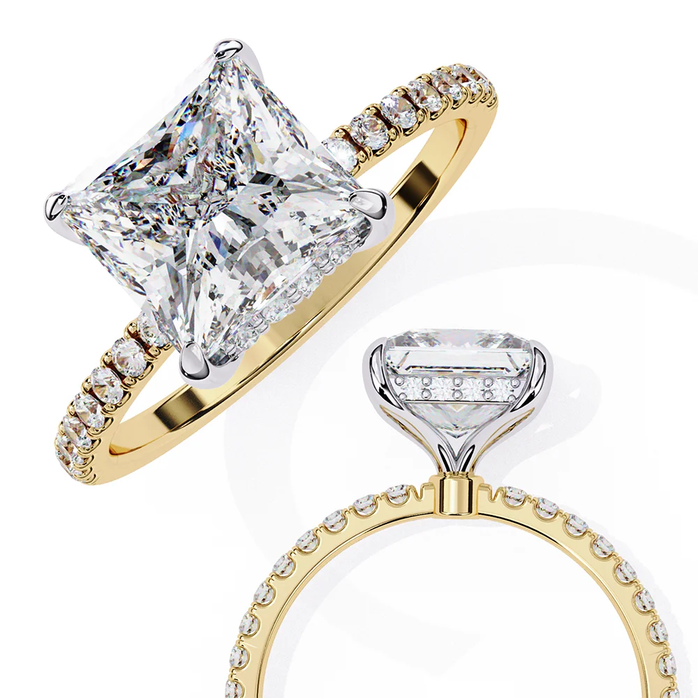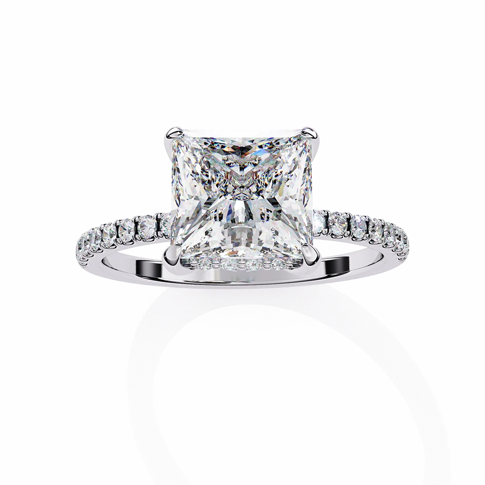 Princess solitaire set in a diamond studded collet, showcasing the centre stone.
