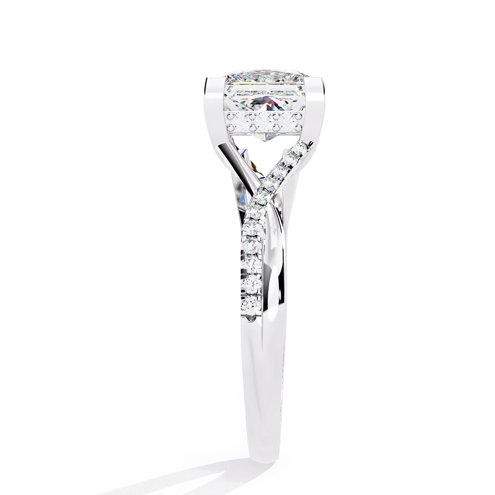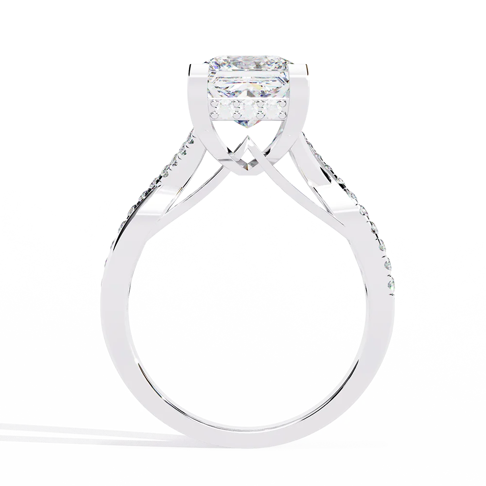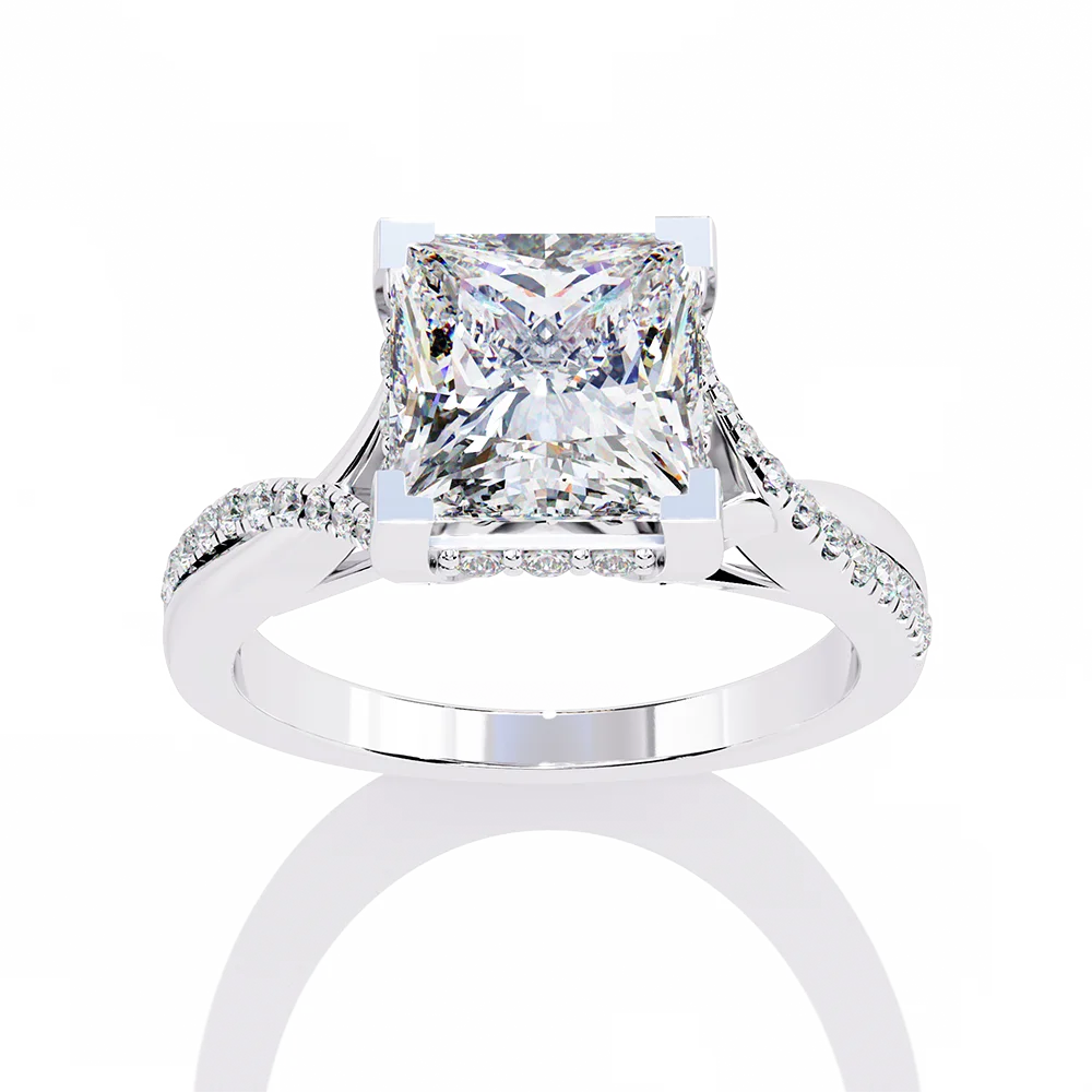 Princess-cut solitaire set on a symmetric shank, highlighting balanced proportions.