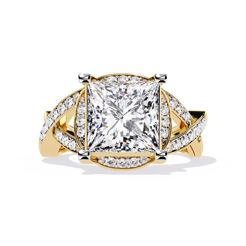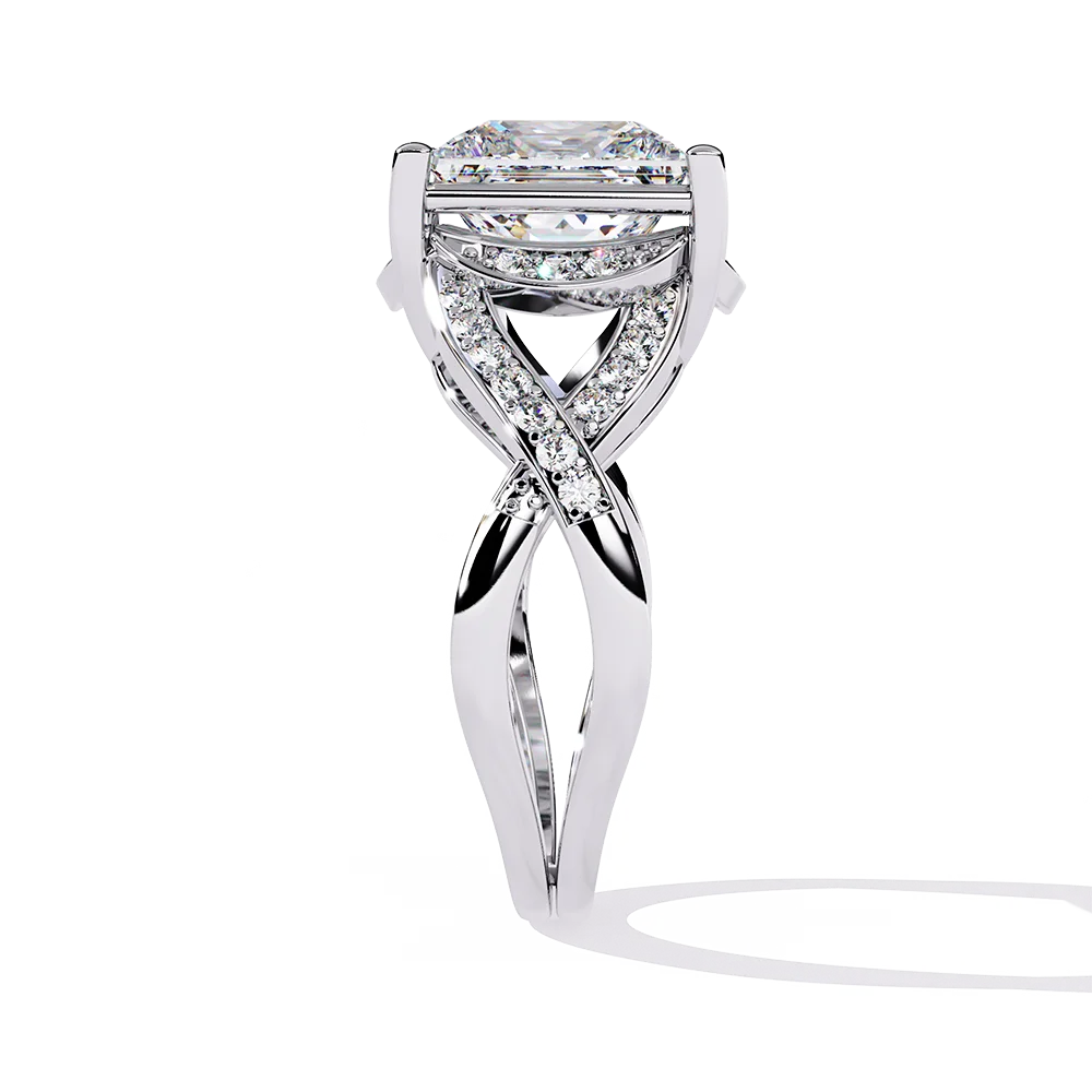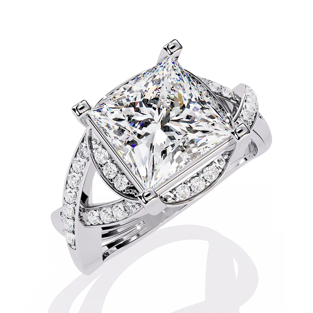 Princess solitaire on a symmetric band, emphasizing clean, even flow of metal having diamonds.