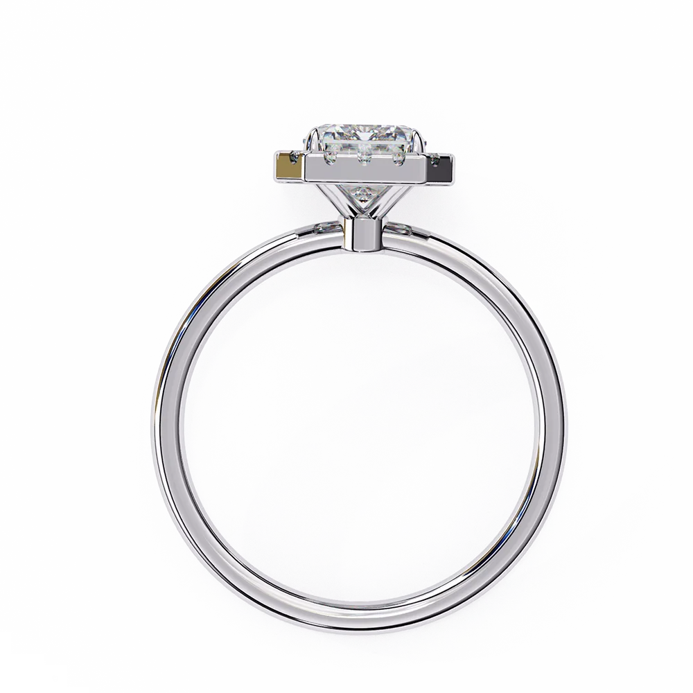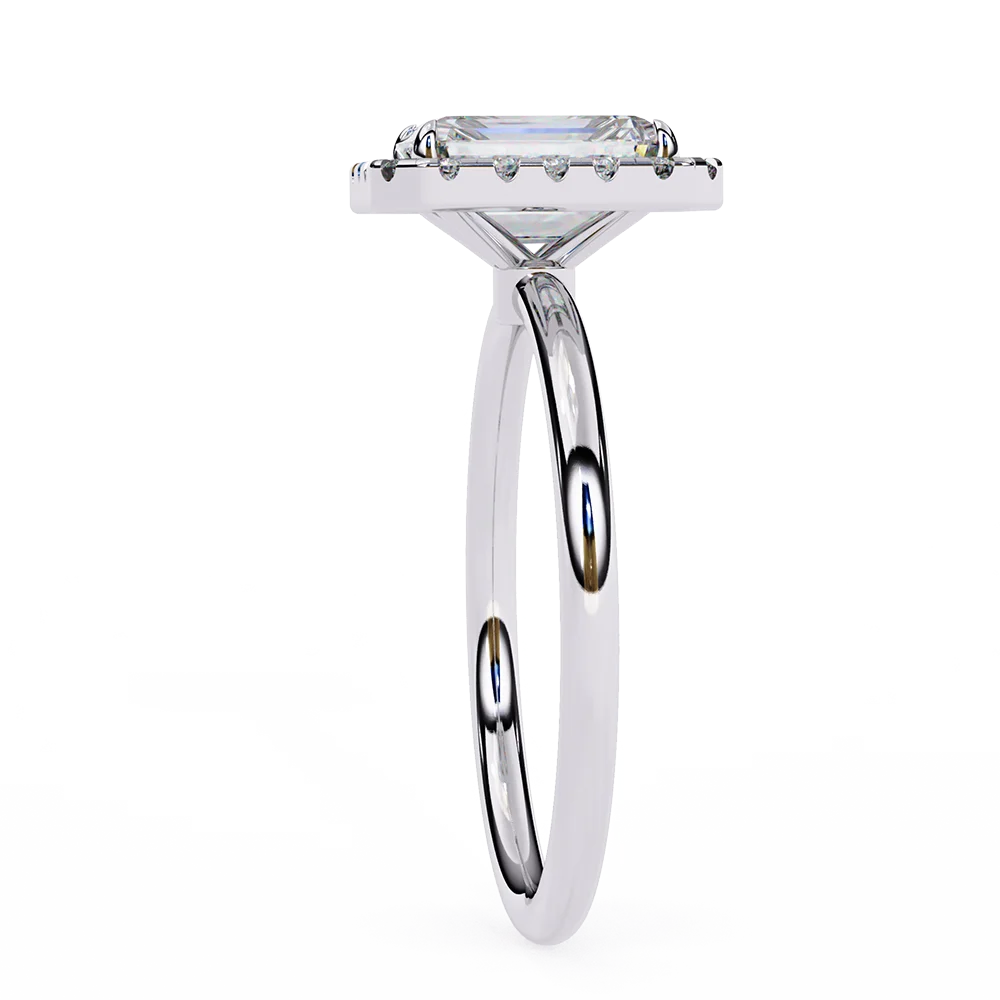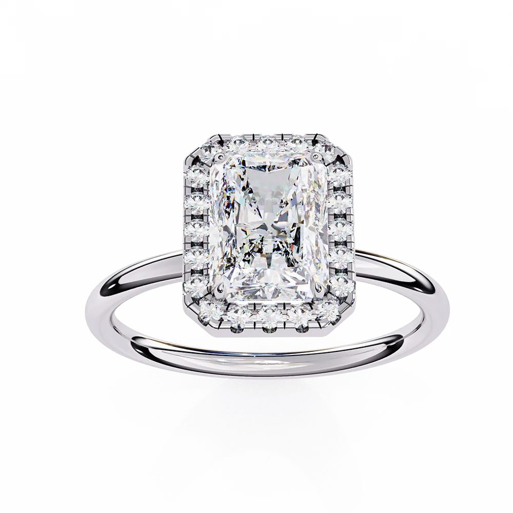 Radiant-cut solitaire halo diamond ring with simple sleek shank for classy look.