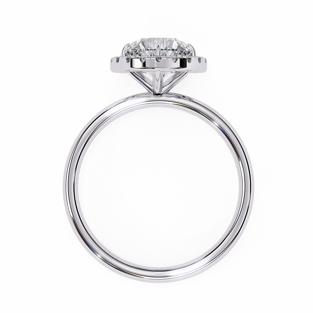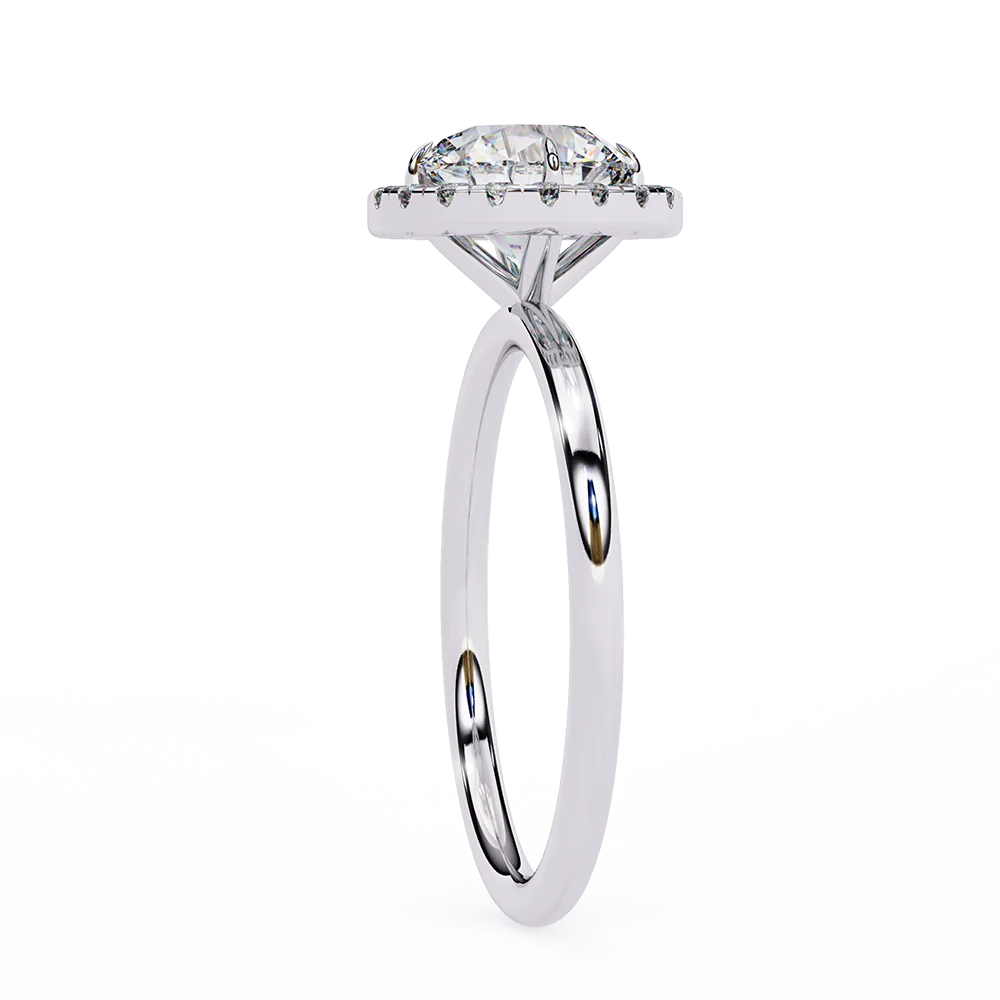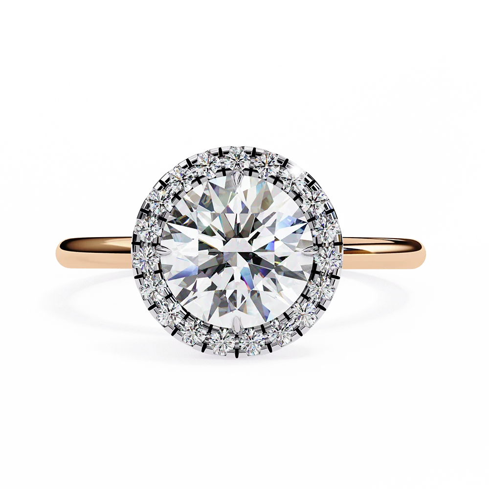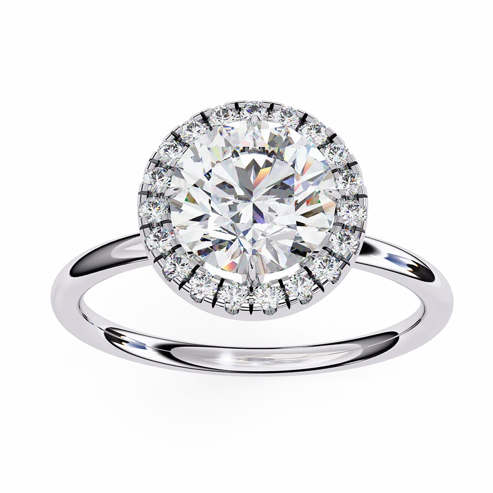 Round solitaire with diamond halo and plain band, emphasizing the centre stone.