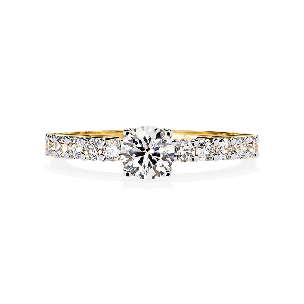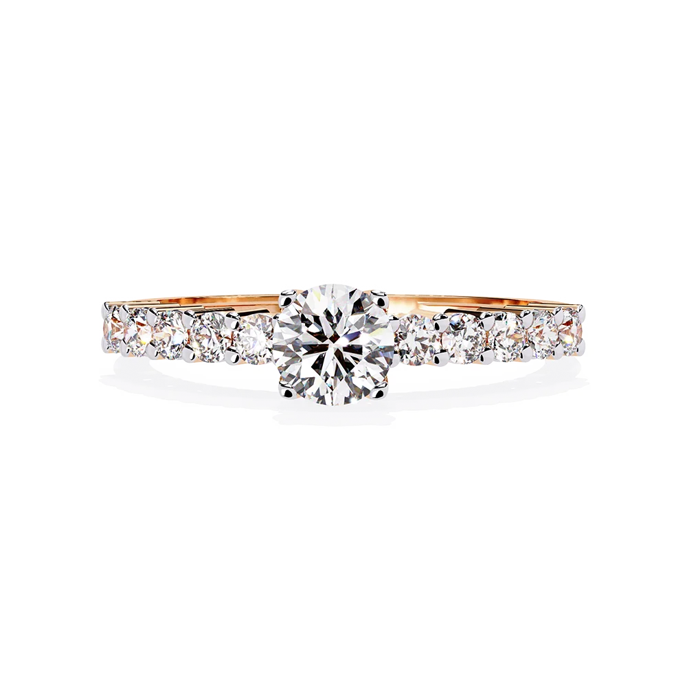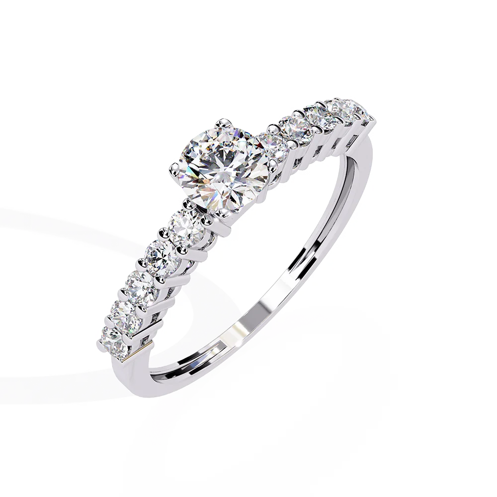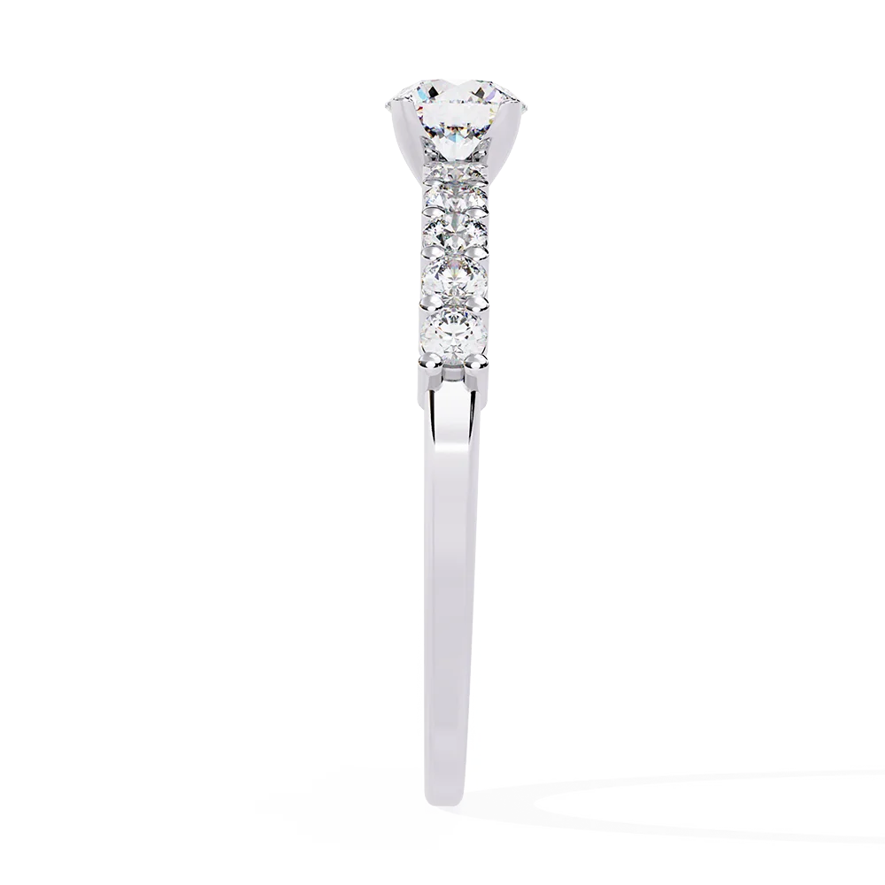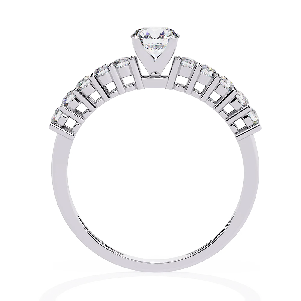 Round solitaire ring designed for daily wear, set on a shank accented with collet diamonds.