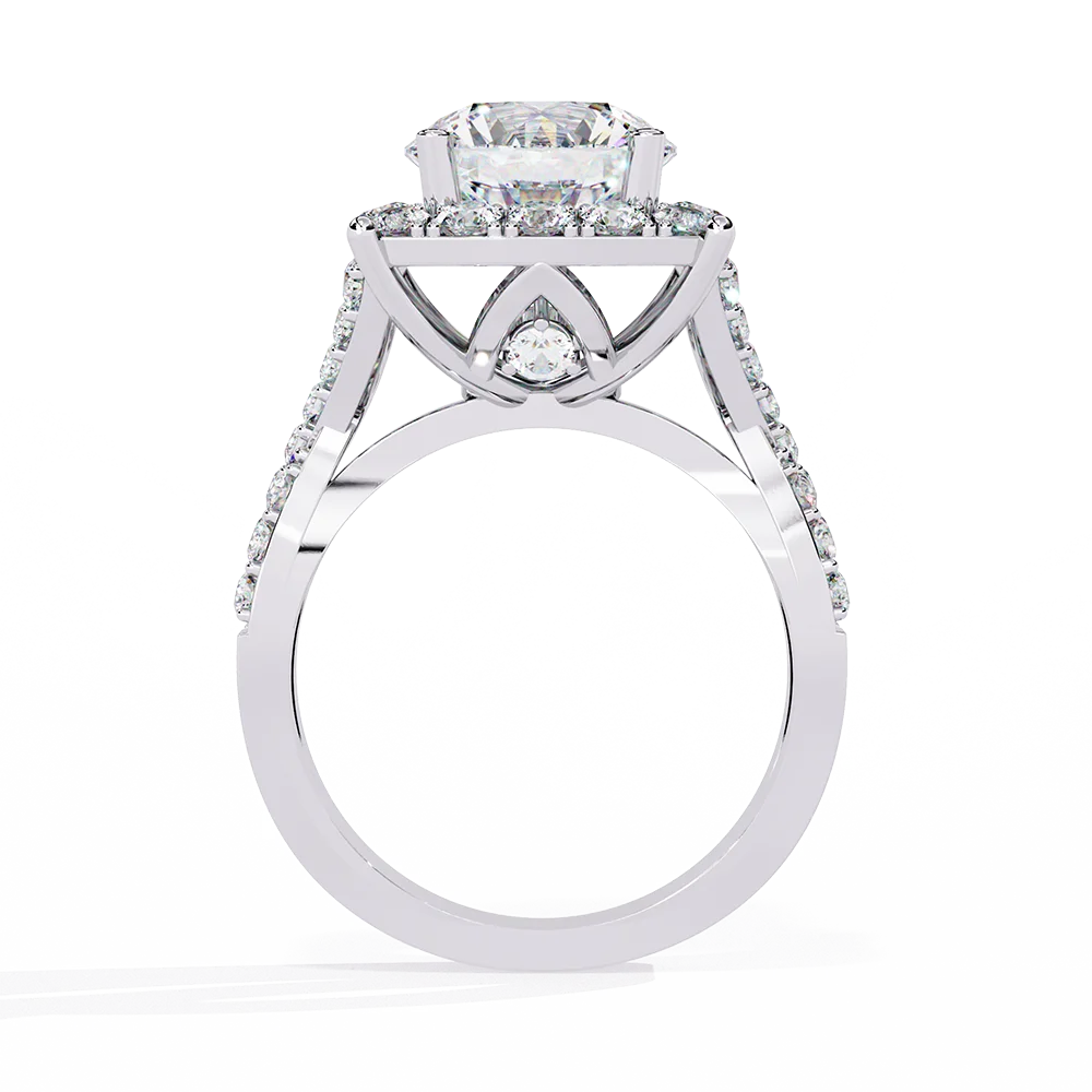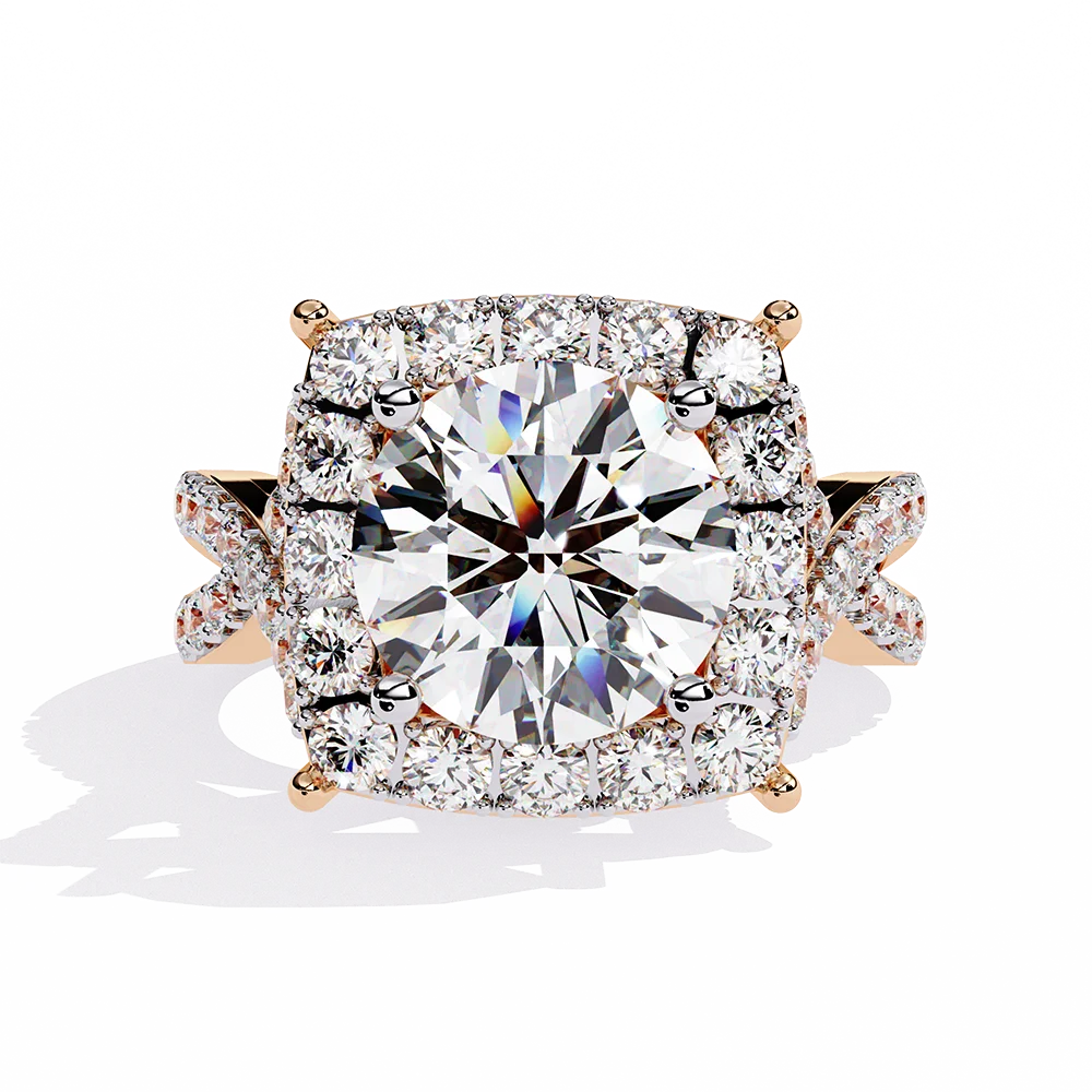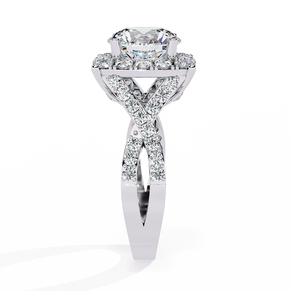 Ring having Round solitaire mounted on a crisscrossing diamond shank with structured alignment.
