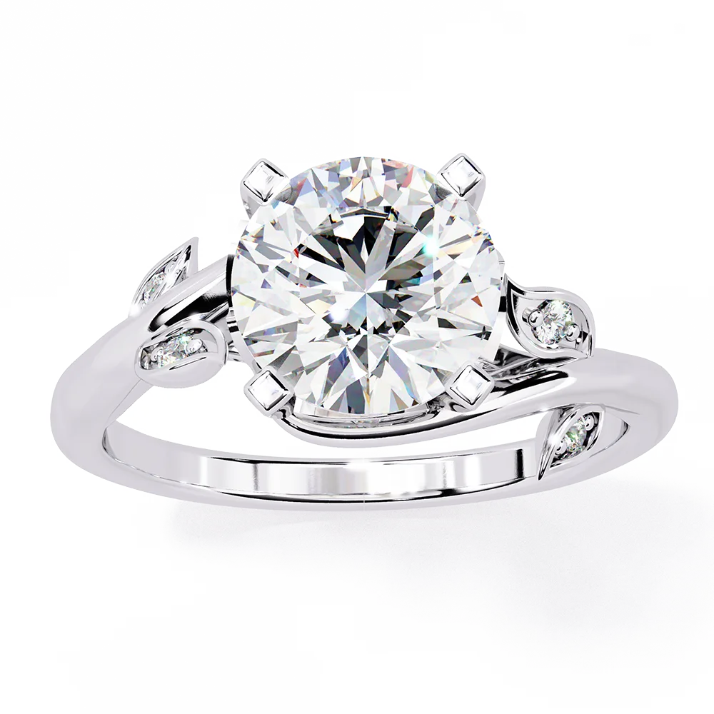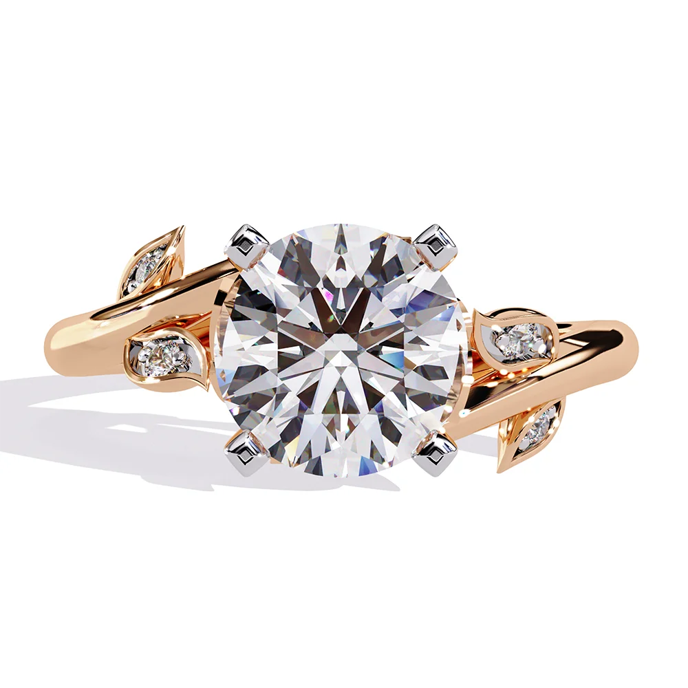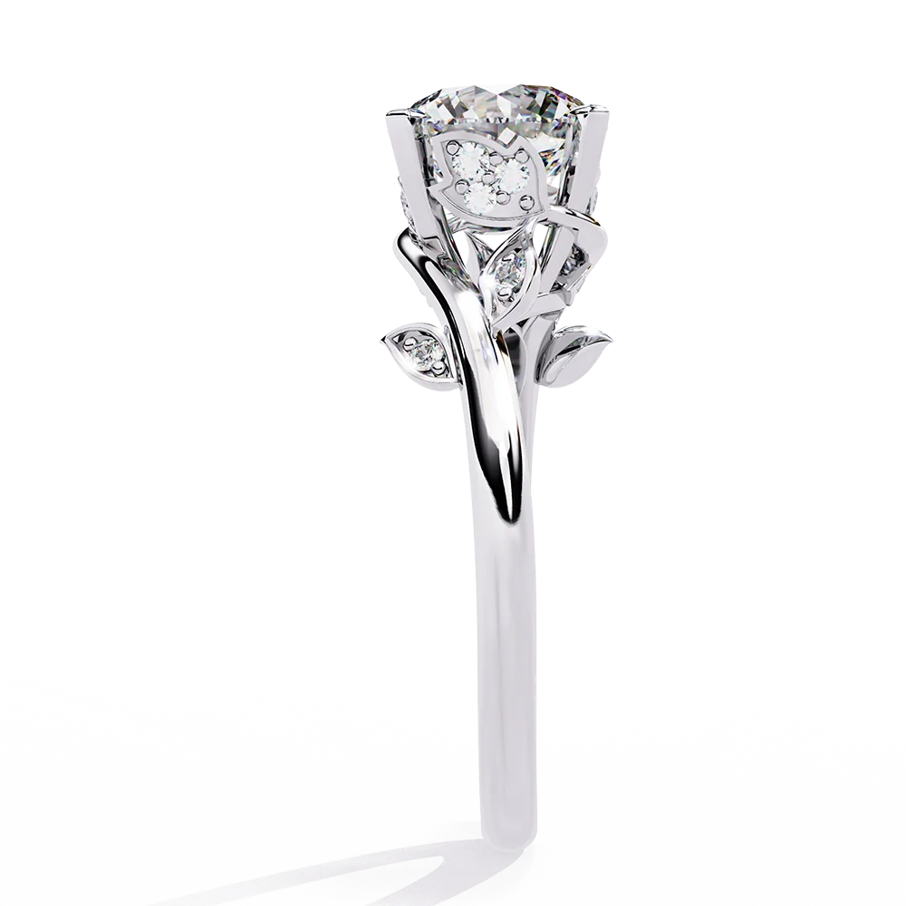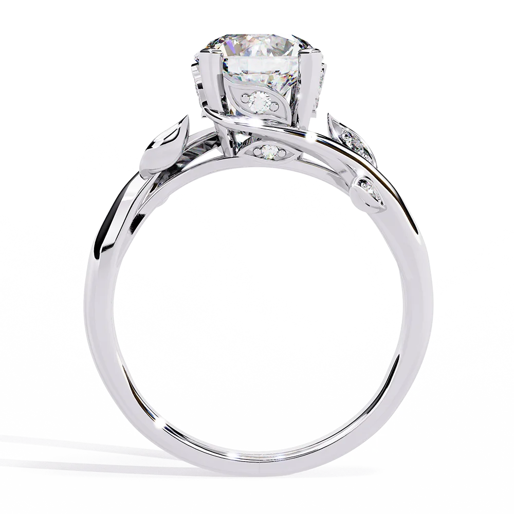 Ring with Round solitaire set on a diamond-studded leaf-pattern band with refined detailing.