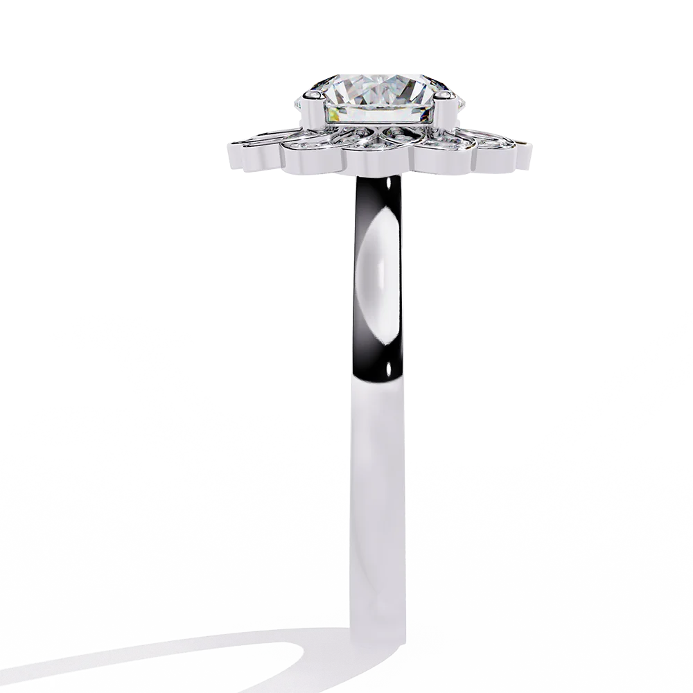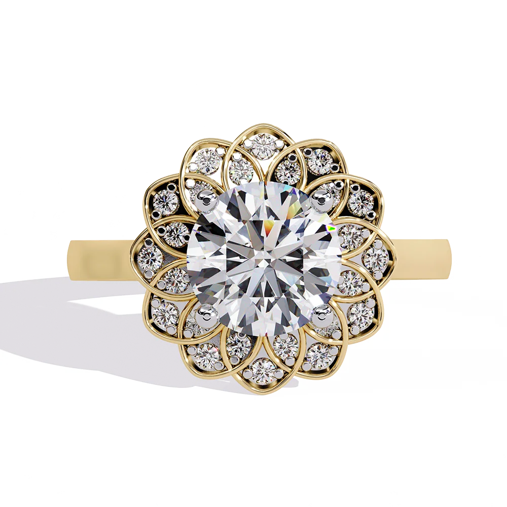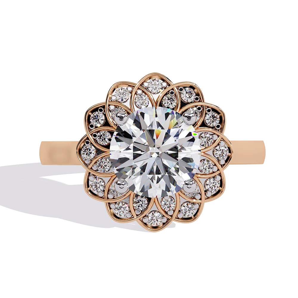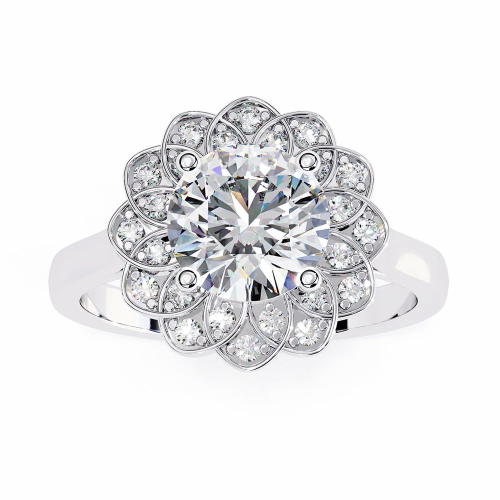 Ring with Round solitaire encircled by a surrounding flower-pattern design of smaller diamonds.