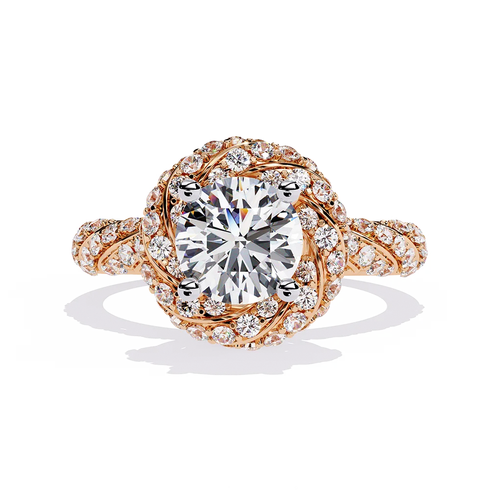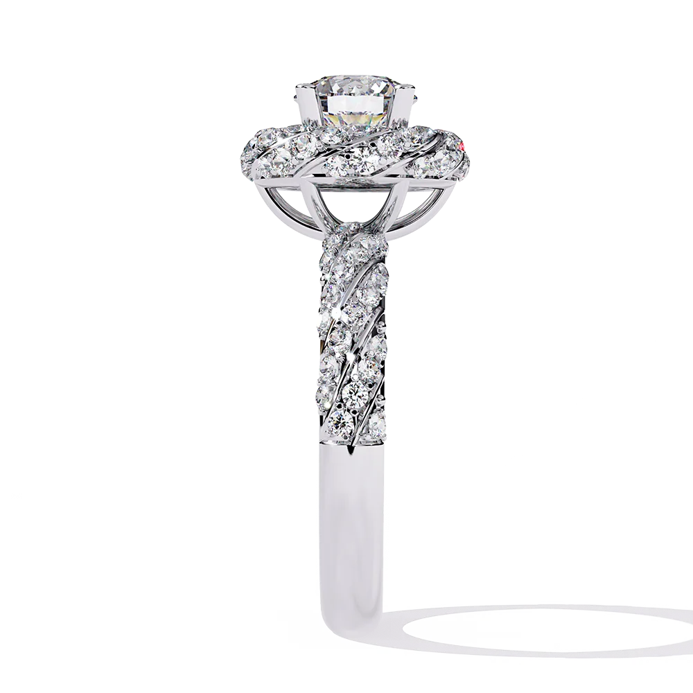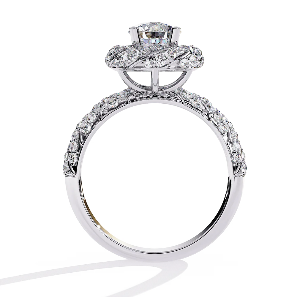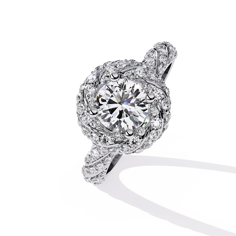 Round solitaire mounted on a spiral diamond-studded shank with flowing symmetry.