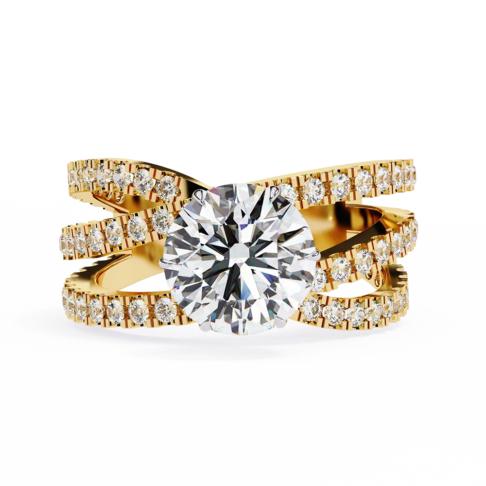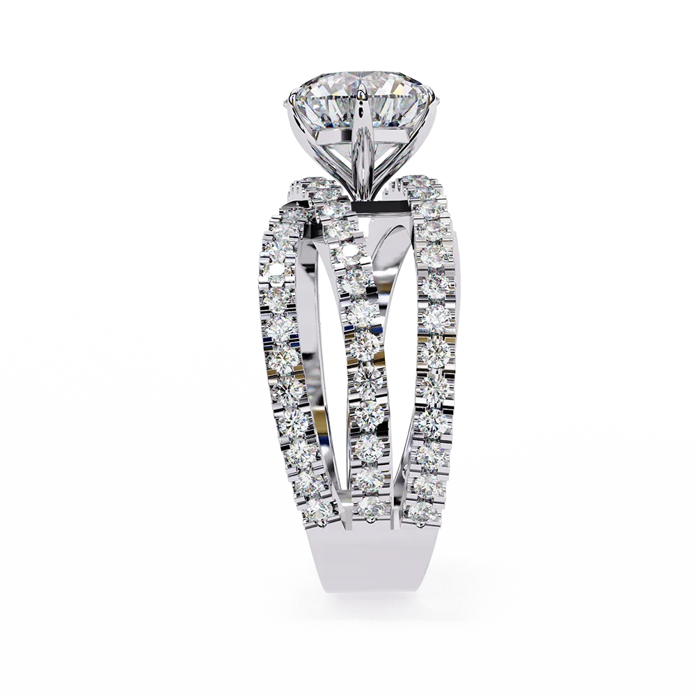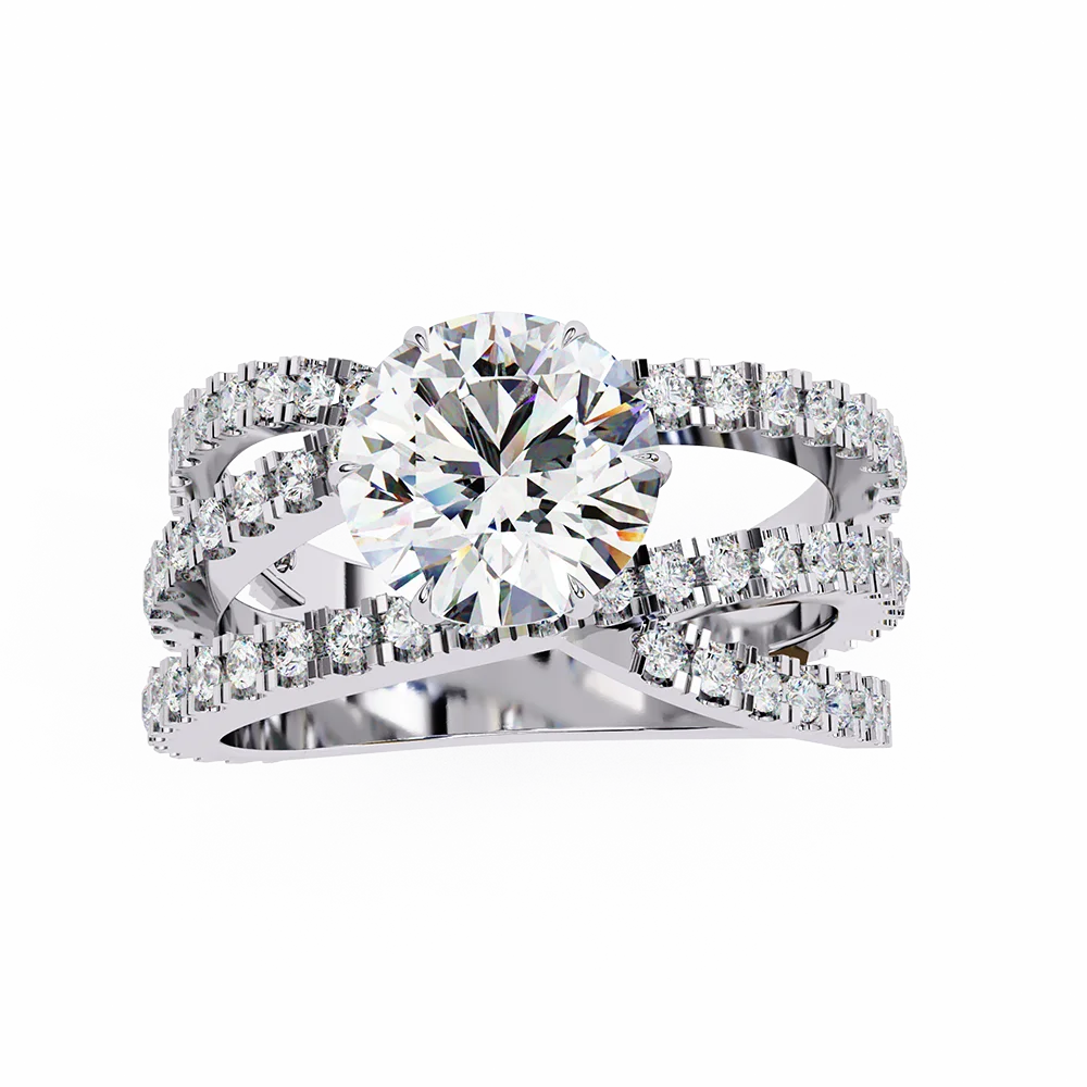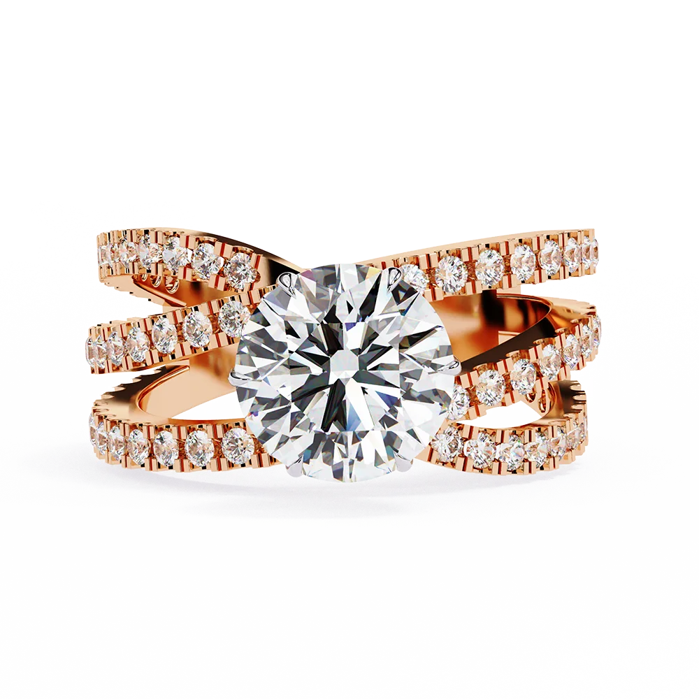 Round solitaire set on a flowing triple-band diamond shank with flowing alignment.
