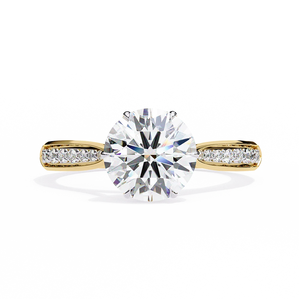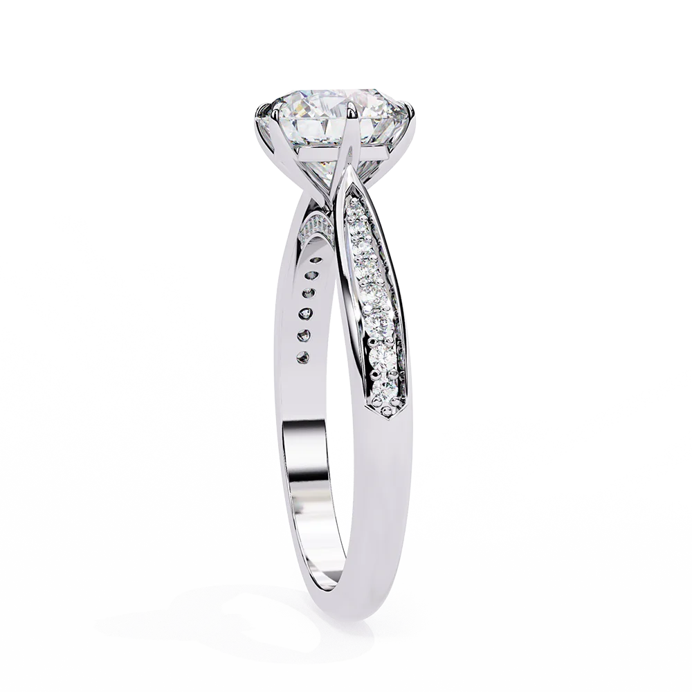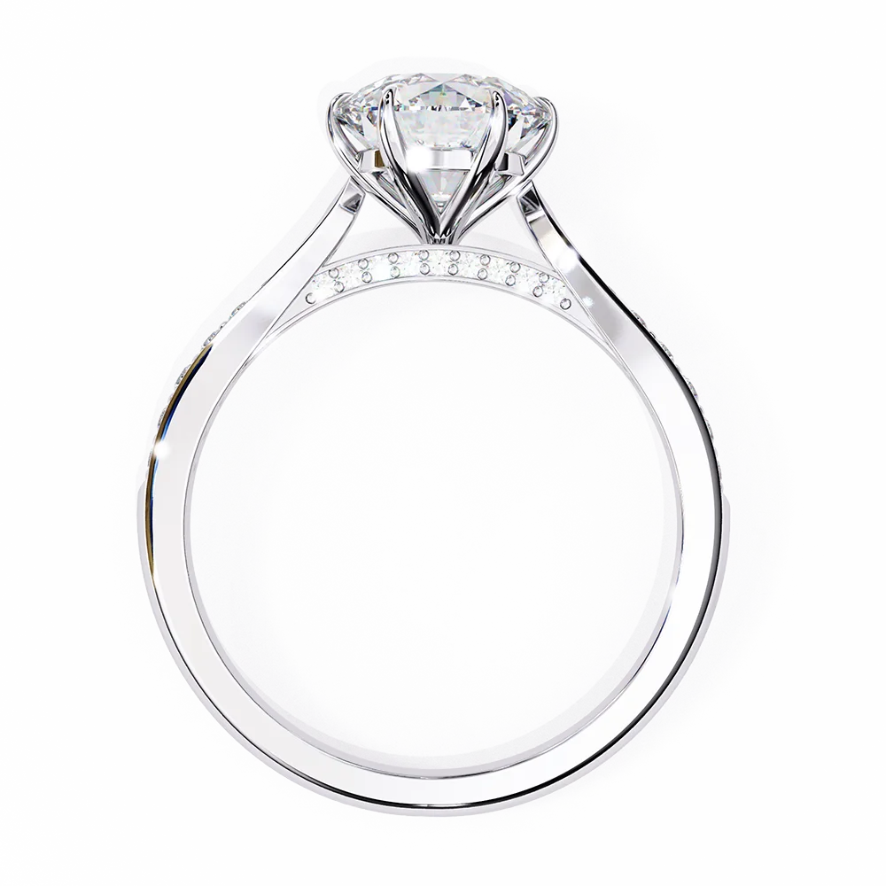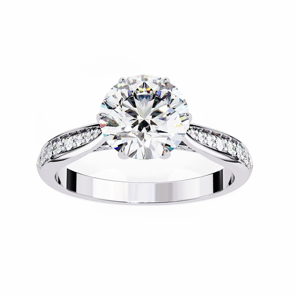 Round solitaire set on a pavé diamond shank, highlighting the central stone with uniform alignment.