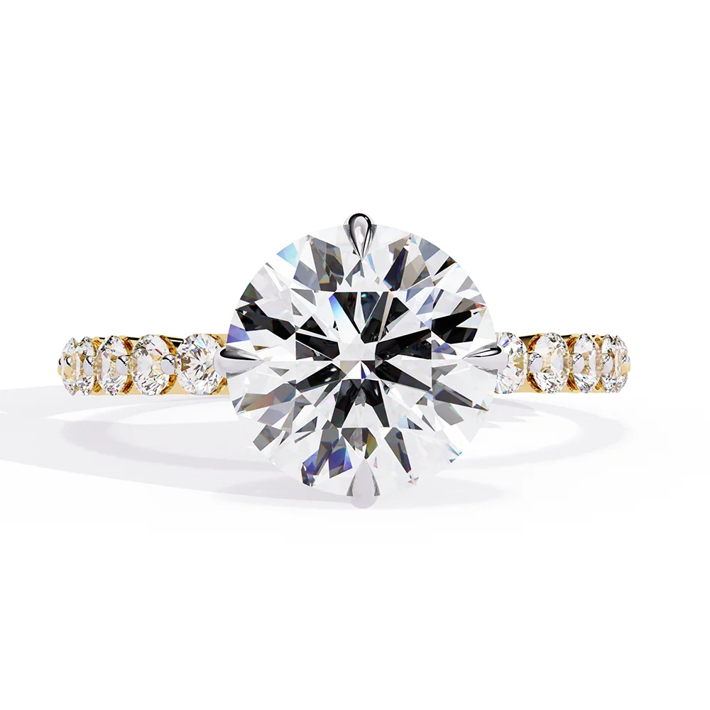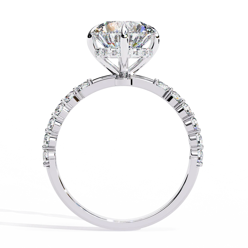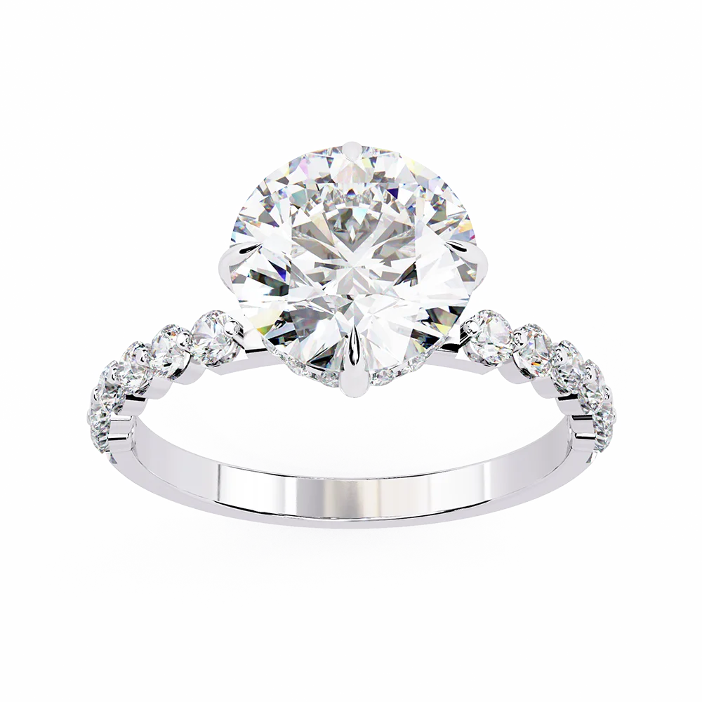 Round solitaire set on a diamond-studded collet having a band with collet diamonds.