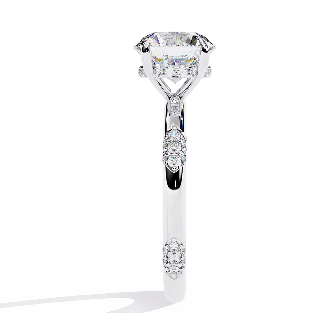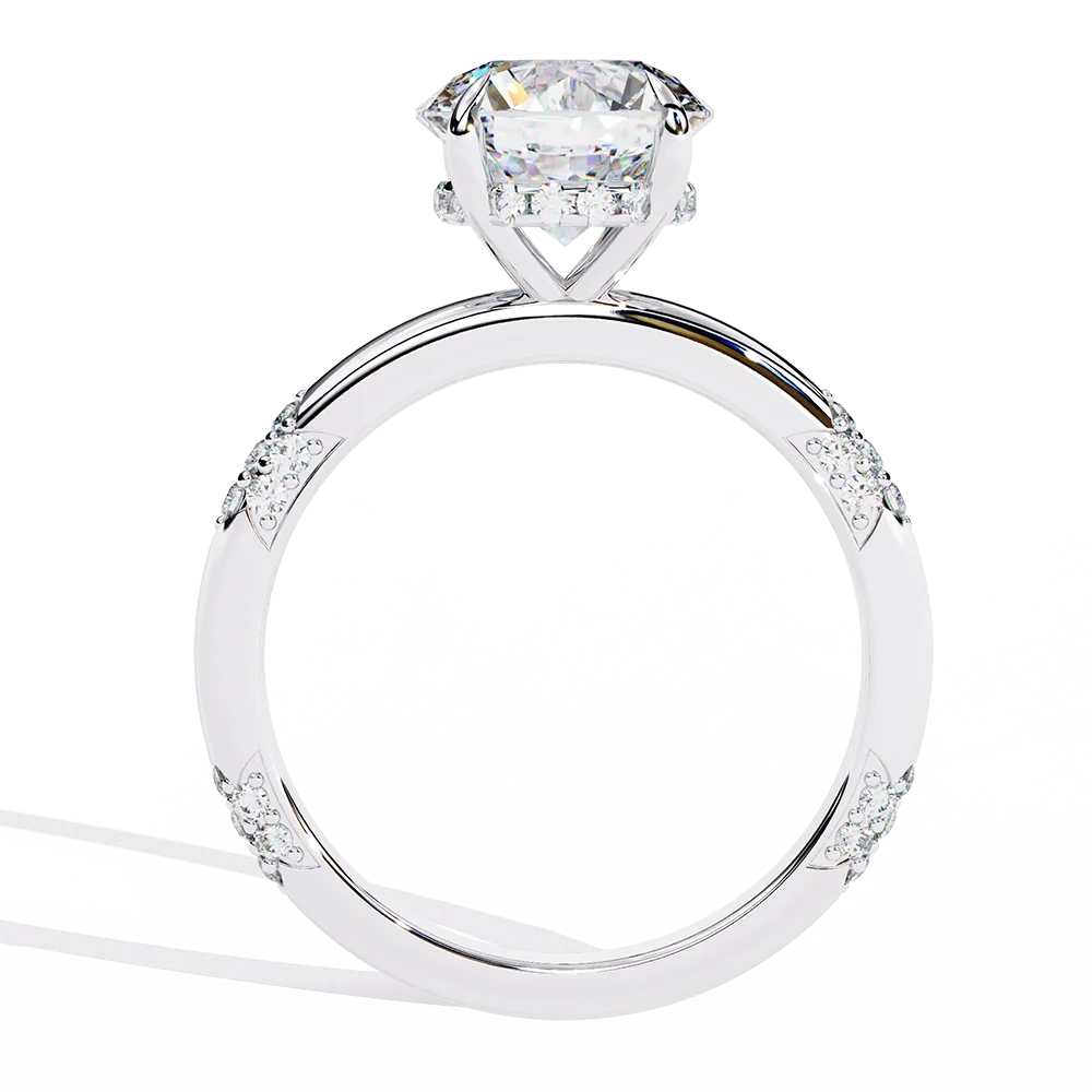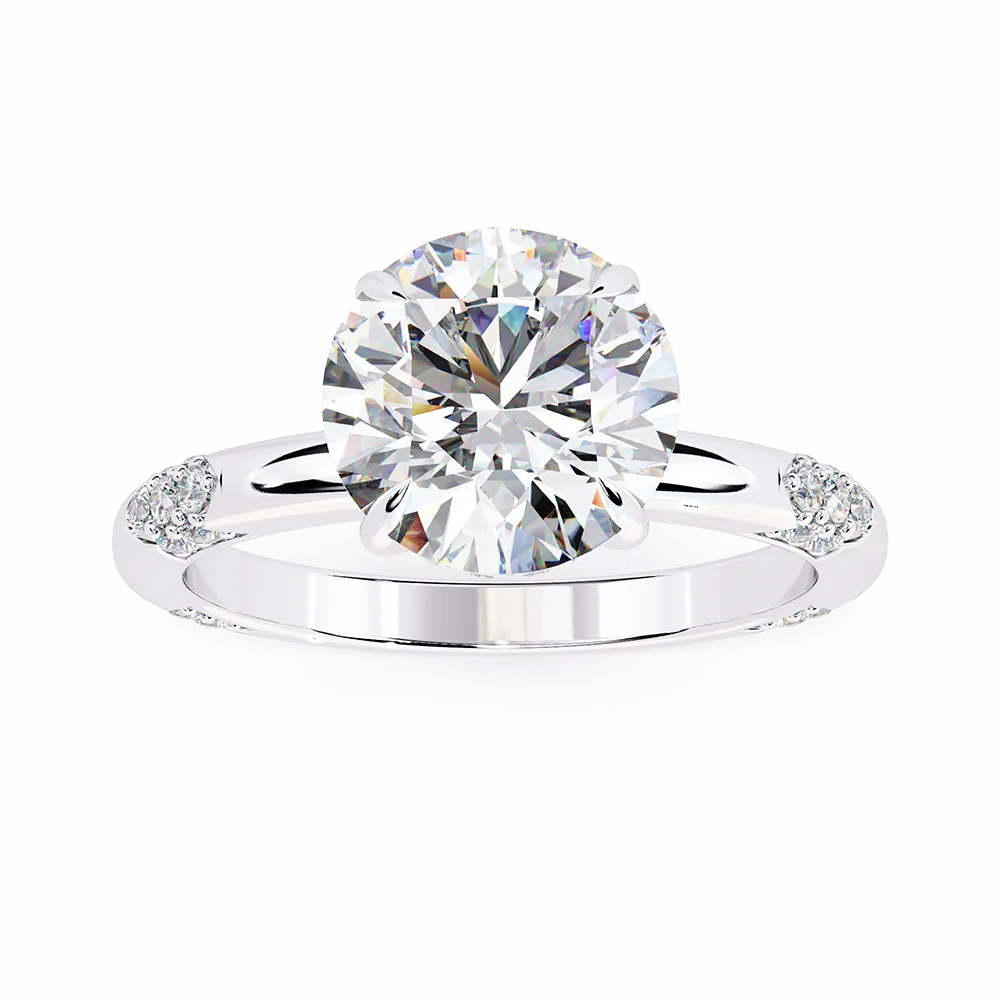 Round solitaire set on a fancy-designed shank, giving the ring an elegant and structured appearance.